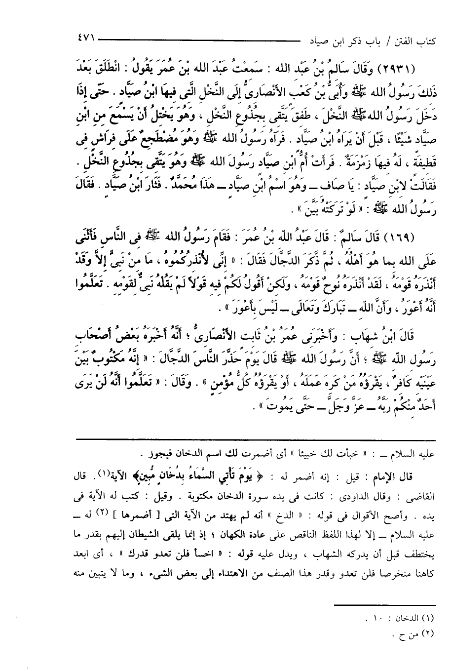 (2931) وَقَالَ سَالِمُ بْنُ عَبْدِ الله: سَمِعْتُ عَبْدَ الله بْنَ عُمَرَ يَقُولُ: انْطَلَقَ بَعْدَ ذَلِكَ رَسُولُ الله صَلَّى اللَّهُ عَلَيْهِ وَسَلَّمَ وَأُبَىُّ بْنُ كَعْبٍ الأَنْصَارِىُّ إِلَى النَّخْلِ الَّتِى فِيهَا ابْنُ صَيَّادٍ. حَتّى إِذَا دَخَلَ رَسُولُ الله صَلَّى اللَّهُ عَلَيْهِ وَسَلَّمَ النَّخْلَ، طَفِقَ يَتَّقِى بِجُذُوعِ النَّخْلِ، وَهُوَ يَخْتِلُ أَنْ يَسْمَعَ مِنِ ابْنِ صَيَّادٍ شَيْئًا، قَبْلَ أَنْ يَرَاهُ ابْنُ صَيَّادٍ. فَرَآهُ رَسُولُ الله صَلَّى اللَّهُ عَلَيْهِ وَسَلَّمَ وَهُوَ مُضطَجِعٌ عَلَى فِرَاشٍ فِى قَطِيفَةٍ، لَهُ فِيهَا زَمْزَمَةٌ. فَرأَتْ أُمُّ ابْنِ صَيَّادٍ رَسُولَ الله صَلَّى اللَّهُ عَلَيْهِ وَسَلَّمَ وَهُوَ يَتَّقِى بِجُذُوعِ النَّخْلِ. فَقَالَتْ لابْنِ صَيَّادٍ: يَا صَافِ - وَهُوَ اسْمُ ابْنِ صَيَّادٍ - هَذَا مُحَمَّدٌ. فَثَارَ ابْنُ صَيَّادٍ. فَقَالَ رَسُولُ الله صَلَّى اللَّهُ عَلَيْهِ وَسَلَّمَ: " لَوْ تَرَكَتْهُ بَيَّنَ ".