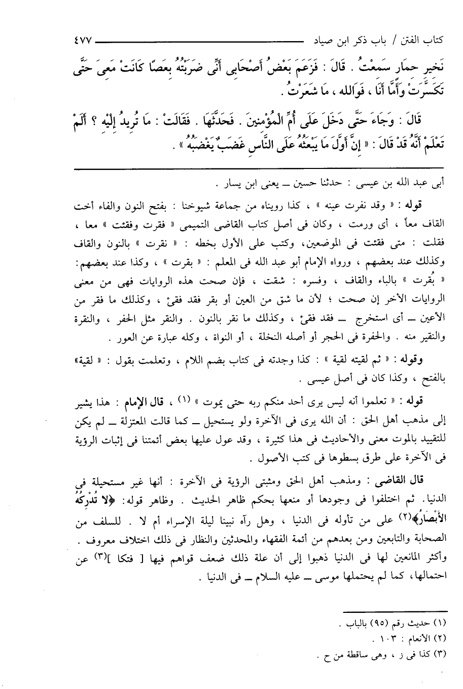 قال القاضى: ومذهب أهل الحق ومثبتى الرؤية فى الآخرة: أنها غير مستحيلة فى الدنيا. ثم اختلفوا فى وجودها أو منعها بحكم ظاهر الحديث. وظاهر قوله: {لا تدْرِكُهُ الأَبْصَارُ} (¬2) على من تأوله فى الدنيا، وهل رآه نبينا ليلة الإسراء أم لا. للسلف من الصحابة والتابعين ومن بعدهم من أئمة الفقهاء والمحدثين والنظار فى ذلك اختلاف معروف. وأكثر المانعين لها فى الدنيا ذهبوا إلى أن علة ذلك ضعف قواهم فيها [فتكا] (¬3) عن احتمالها، كما لم يحتملها موسى - عليه السلام - فى الدنيا.