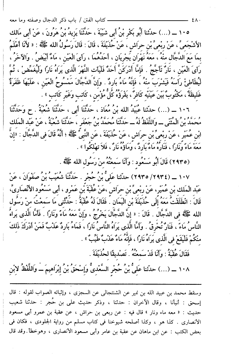 107 - (2934/ 2935) حدّثنا عَلِىُّ بْنُ حُجْرٍ. حَدَّثَنَا شُعَيْبُ بْنُ صَفْوَانَ، عَنْ عَبْدِ الْمَلِكِ بْنِ عُمَيْرٍ، عَنْ رِبْعِىِّ بْنِ حِرَاشٍ، عَنْ عُقْبَةَ بْنِ عَمْرٍو، أَبِى مَسْعُودٍ الأَنْصَارِىِّ، قَالَ: انْطَلَقْتُ مَعَهُ إِلَى حُذَيْفَةَ بْنِ الْيَمَان. فَقَالَ لَهُ عُقْبَةُ: حَدِّثْنِى مَا سَمِعْتَ مِنْ رَسُولِ الله صَلَّى اللَّهُ عَلَيْهِ وَسَلَّمَ فِى الدَّجَّالِ. قَالَ: " إِنَّ الدَّجَّالَ يَخْرُجُ، وَإِنَّ مَعَهُ مَاءً وَنَارًا. فَأَمَّا الَّذِى يَراهُ النَّاسُ مَاءً، فَنَارٌ تُحْرِقُ. وَأَمَّا الَّذِى يَرَاهُ النَّاسُ نَارًا، فَمَاءُ بَارِدٌ عَذْبٌ فَمَنْ أَدْرَكَ ذَلِكَ مِنْكُمْ فَلْيَقَعْ فِى الَّذِى يَرَاهُ نَارًا، فَإِنَّهُ مَاءٌ عَذْبٌ طَيِّبٌ ".