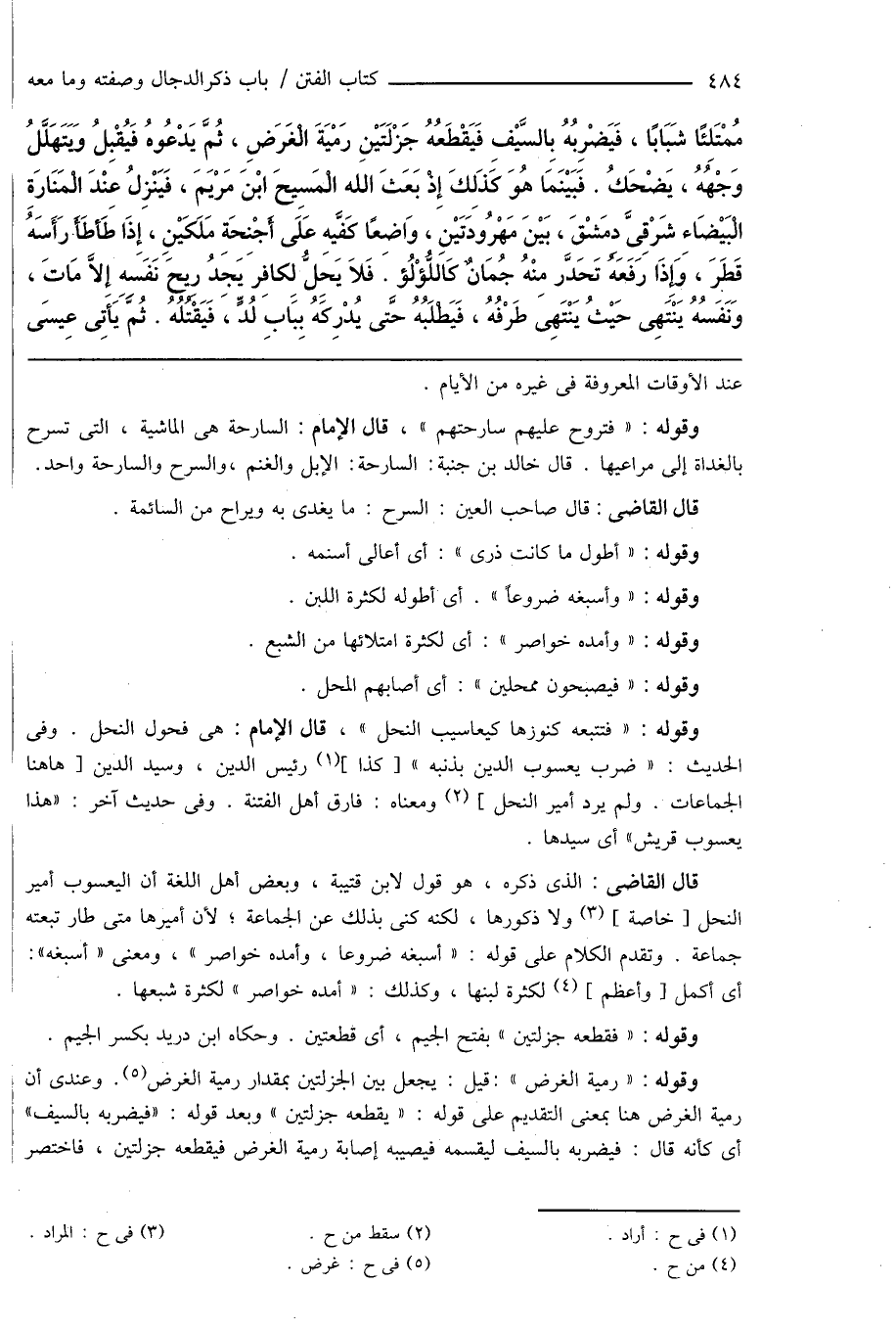 مُمْتَلِئًا شَبَابًا، فَيَضْرِبُهُ بِالسَّيْفِ فَيَقْطَعُهُ جَزْلَتَيْنِ رَمْيَةَ الْغَرَضِ، ثُمَّ يَدْعُوهُ فَيُقْبِلُ وَيَتَهَلَّلُ وَجْهُهُ، يَضْحَكُ. فَبَيْنَمَا هُوَ كَذَلِكَ إِذْ بَعَثَ الله الْمَسِيحَ ابْنَ مَرْيَمَ، فَيَنْزِلُ عِنْدَ الْمَنَارَةِ الْبَيْضَاءِ شَرْقِىَّ دِمَشْقَ، بَيْنَ مَهْرُودَتَيْنِ، وَاضِعًا كَفَّيهِ عَلَى أَجْنِحَةِ مَلَكَيْنِ، إِذَا طَأطَأَ رَأَسَهُ قَطَرَ، وَإِذَا رَفَعَهُ تَحَدَّر مِنْهُ جُمَانٌ كَاللُّؤْلُؤ. فَلاَ يَحِلُّ لِكافِر يَجِدُ رِيحَ نَفَسِهِ إِلاَّ مَاتَ، وَنَفَسُهُ يَنْتَهِى حَيْثُ يَنْتَهِى طَرْفُهُ، فَيَطْلَبُهُ حَتَّى يُدْرِكَهُ بِبَابِ لُدٍّ، فَيَقْتلُهُ. ثُمَّ يَأتِى عِيسَى