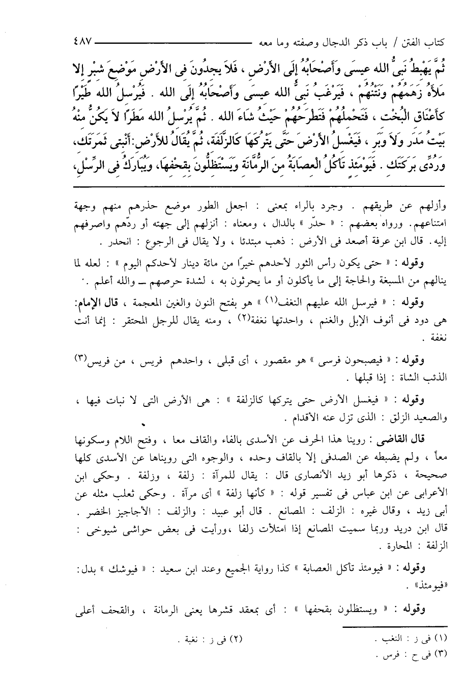 وقوله: " حتى يكون رأس الثور لاحدهم خيرًا من مائة دينار لأحدكم اليوم ": لعله لما ينالهم من المسبغة والحاجة إلى ما يأكلون أو ما يحرثون به، لشدة حرصهم - والله أعلم. وقوله: " فيرسل الله عليهم النغف (¬1) " هو بفتح النون والغين المعجمة، قال الإمام: هى دود فى أنوف الإبل والغنم، واحدتها نغفة (¬2)، ومنه يقال للرجل المحتقر: إنما أنت نغفة.