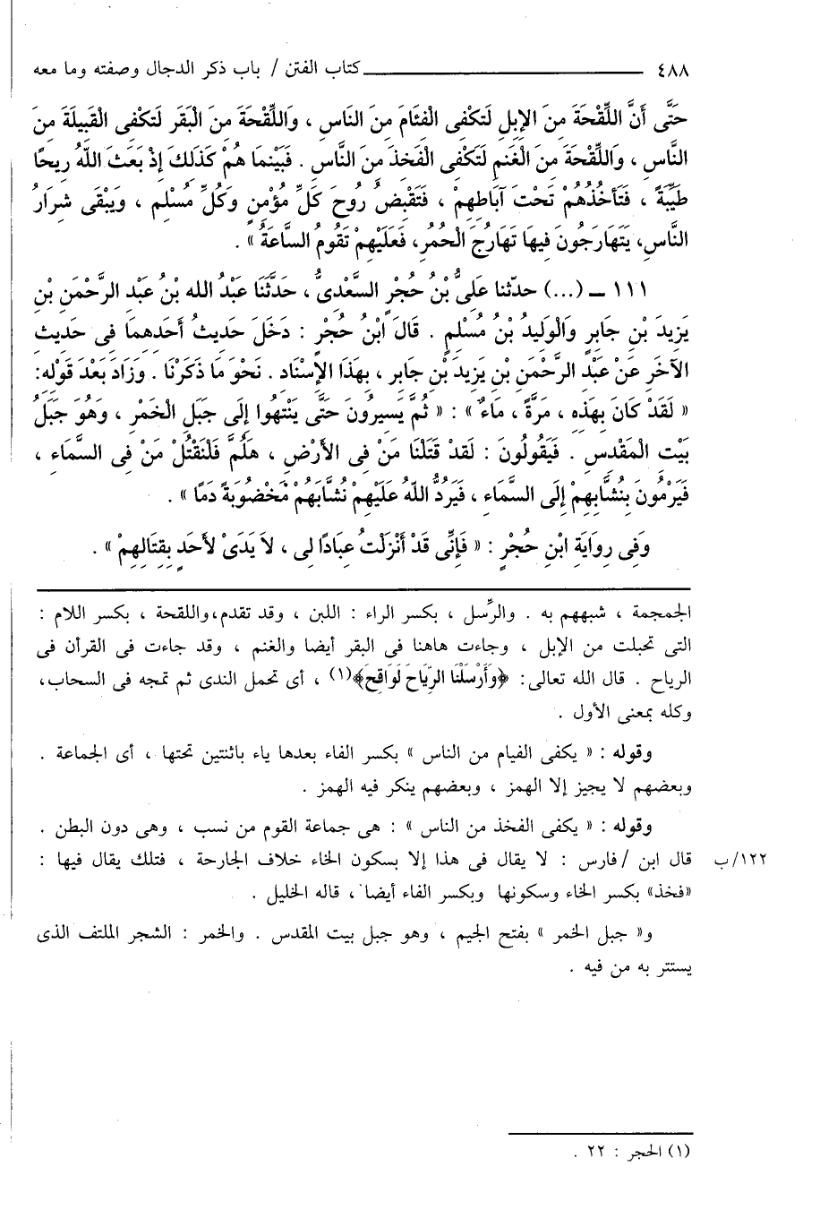 111 - (...) حدّثنا عَلِىُّ بْنُ حُجْرٍ السَّعْدِىُّ، حَدَّثَنَا عَبْدُ الله بْنُ عَبْدِ الرَّحْمَنِ بْنِ يَزِيدَ بْنِ جَابِرٍ وَالْوَلِيدُ بْنُ مُسْلِمٍ. قَالَ ابْنُ حُجْرٍ: دَخَلَ حَدِيثُ أَحَدِهِمَا فِى حَدِيثِ الآخَرِ عَنْ عَبْدِ الرَّحْمَنِ بْنِ يَزِيدَ بْنِ جَابِر، بِهَذَا الإِسْنَادِ. نَحْوَ مَا ذَكَرْنَا وَزَادَ بَعْدَ قَوْلِهِ: " لَقَدْ كَانَ بِهَذِهِ، مَرَّةً، مَاءٌ ": " ثُمَّ يَسِيرُونَ حَتَّى يَنْتهُوا إِلَى جَبَلِ الْخَمْرِ، وَهُوَ جَبَلُ بَيْتِ الْمَقْدِسِ. فَيَقُولُونَ: لَقدْ قَتَلْنَا مَنْ فِى الأَرْضِ، هَلُمَّ فَلْنَقْتُلْ مَنْ فِى السَّمَاءِ، فَيَرْمُونَ بِنُشَّابِهِمْ إِلَى السَّمَاءِ، فَيَرُدُّ اللهُ عَلَيْهِمْ نُشَّابَهُمْ مَخْضُوَبةً دَمًا ".