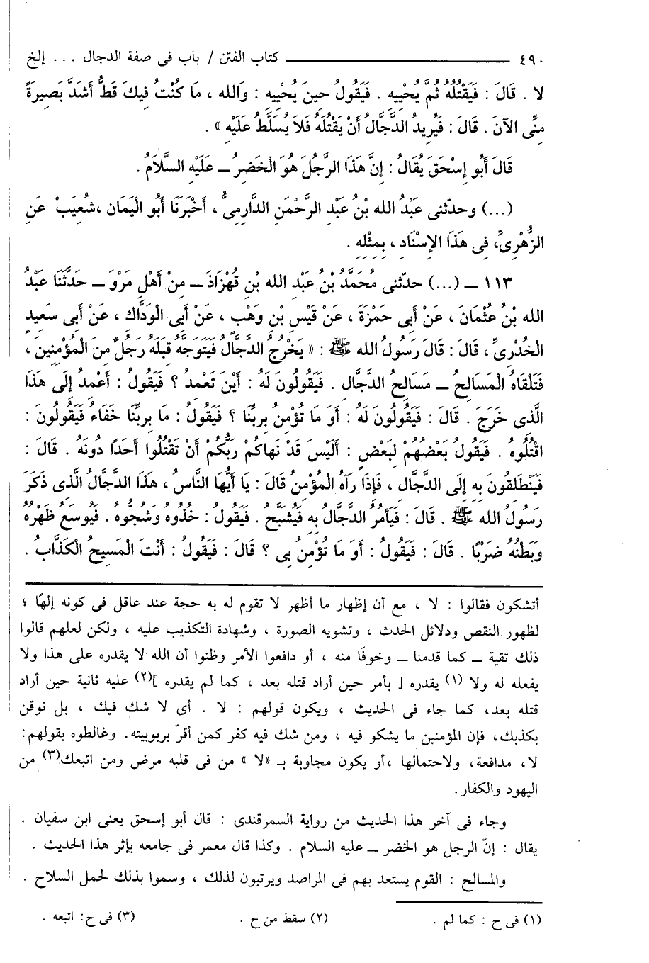 113 - (...) حدّثنى مُحَمَّدُ بْنُ عَبْدِ الله بْنِ قُهْزَاذَ - مِنْ أَهْلِ مَرْوَ - حَدَّثَنَا عَبْدُ الله بْنُ عُثْمَانَ، عَنْ أَبِى حَمْزَةَ، عَنْ قَيْسِ بْنِ وَهْبٍ، عَنْ أَبِى الْوَدَّاكِ، عَنْ أَبِى سَعِيدٍ الْخُدْرِىِّ، قَالَ: قَالَ رسُولُ الله صَلَّى اللَّهُ عَلَيْهِ وَسَلَّمَ: " يَخْرُجُ الدَّجَّالُ فَيَتَوَجَّهُ قِبَلَهُ رَجُلٌ مِنَ الْمُؤْمِنِينَ، فَتَلْقَاهُ الْمَسَالِحُ - مَسَالِحُ الدَّجَّالِ. فَيَقُولُونَ لَهُ: أَيْنَ تَعْمِدُ؟ فَيَقُولُ: أَعْمِدُ إِلَى هَذَا الَّذِى خَرَجَ. قَالَ: فَيَقُولُونَ لَهُ: أَوَ مَا تُؤْمِنُ بِربِّنَا؟ فَيَقُولُ: مَا بِربِّنَا خَفَاءُ فَيَقُولُونَ: اقْتُلُوهُ. فَيَقُولُ بَعْضُهُمْ لِبَعْضٍ: أَلَيْسَ قَدْ نَهاكُمْ رَبُّكُمْ أَنْ تَقْتُلُوا أَحَدًا دُونَهُ. قَالَ: فَيَنْطَلِقُونَ بِهِ إِلَى الدَّجَّالِ، فَإِذَا رَآهُ الْمُؤْمِنُ قَالَ: يَا أَيُّهَا النَّاسُ، هَذَا الدَّجَّالُ الَّذِى ذَكَرَ رَسُوَلُ الله صَلَّى اللَّهُ عَلَيْهِ وَسَلَّمَ. قَالَ: فَيَأمُرُ الدَّجَّالُ بِهِ فَيُشَبَّحُ. فَيَقُولُ: خُذُوهُ وَشُجُّوهُ. فَيُوسَعُ ظَهْرُهُ وَبَطْنُهُ ضَرْبًا. قَالَ: فَيَقُولُ: أَوَ مَا تُؤْمِنُ بِى؟ قَالَ: فَيَقُولُ: أَنْتَ الْمَسِيحُ الْكَذَّابُ.
