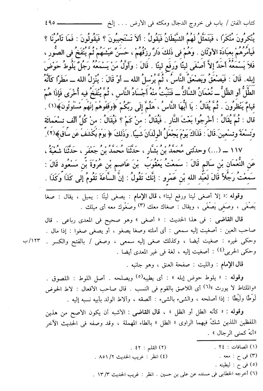 يُنْكِرُونَ مُنْكَرًا، فَيَتَمَثَّلُ لَهُمُ الشَّيْطَانُ فَيَقُولُ: أَلاَ تَسْتَجِيبُونَ؟ فَيَقُولُونَ: فَمَا تَأمُرُنَا؟ فَيأمُرُهُمْ بِعِبَادَةِ الأوْثَانِ. وَهُمْ فِى ذَلِكَ دَارٌ رِزْقُهُمْ، حَسَنٌ عَيْشَهُمْ ثُمَّ يُنْفَخُ فِى الصُّورِ، فَلاَ يَسْمَعُهُ أَحَدٌ إِلاَّ أَصْغَى لِيتًا وَرفَع لِيتًا. قَالَ: وَأَوَّلُ مَنْ يَسْمَعُهُ رَجُلٌ يَلُوطُ حَوْضَ إِبِلِهِ. قَالَ: فَيَصْعَقُ وَيَصْعَقُ النَّاسُ، ثُمَّ يُرْسِلُ الله - أَوْ قَالَ: يُنْزِلُ الله - مَطَرًا كَأَنَّهُ الطَّلُّ أَوِ الظِّلُّ - نُعْمَانُ الشَّاكُّ - فَتَنْبُتُ مِنْهُ أَجْسَادُ النَّاسِ، ثُمَّ يُنْفَخُ فِيهِ أُخْرَى فَإِذَا هُمْ قِيامٌ يَنْظرُونَ. ثُمَّ يُقَالُ: يَا أَيُّهَا النَّاسُ، هَلُمَّ إِلَى رَبِّكُمْ {وَقِفُوهُمْ إِنَّهُم مَّسْئُولُونَ} (¬1). قَال: ثُمَّ يُقَالُ: أَخْرِجُوا بَعْثَ النَّارِ. فَيُقَالُ: مِنْ كَمْ؟ فَيُقَالُ: مِنْ كُلِّ أَلْفٍ تِسْعَمِائَةٍ وَتِسْعَةً وتِسْعِينَ. قَالَ: فَذَاكَ يَوْمَ يَجْعَلُ الْوِلْدَانَ شيبًا. وَذَلِكَ {يَوْمَ يُكْشَفُ عَن سَاقٍ} (¬2).