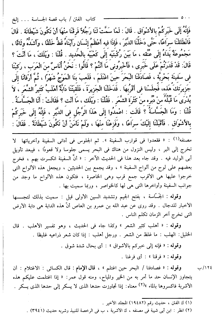 فَإِنَّهُ إلَى خَبَرِكُمْ بِالأَشْوَاق. قَالَ: لَما سَمَّتْ لَنَا رَجُلاً فَرِقْنَا مِنْهَا أَنْ تَكُونَ شَيْطَانَة. قَالَ فَانْطَلقْنَا سِرَاعًا، حَتَّى دَخَلْنَا الدَّيْرَ، فَإِذَا فِيهِ أَعْظَمُ إِنْسَانٍ رَأَيْنَاهُ قَطُّ خَلْقًا، وَأَشَدُّهُ وِثَاقًا، مَجْمُوعَةٌ يَدَاهُ إِلَى عُنُقِهِ، مَا بَيْنَ رُكْبتَيْهِ إِلَى كَعْبَيْهِ بالْحَدِيدِ. قُلْنَا: وَيْلَكَ، مَا أَنْتَ؟ قَالَ: قَدْ قَدَرْتُمْ عَلَى خَبَرِى، فَأَخْبرُونِى مَا أَنْتُمْ؟ قَاَلُوا: نَحْنُ أُنَاسٌ مِنَ الْعَرَبِ، رَكِبْنَا فِى سَفِينَةٍ بَحْرِيَّةٍ، فَصَادَفْنَا الْبَحَرَ حِينَ اغْتَلَمَ، فَلَعِبَ بِنَا الْمَوْجُ شَهْرًا، ثُمَّ أَرْفأنَا إِلَى جَزِيرَتِكَ هَذِهِ، فَجلَسْنا فِى أَقْرُبِهَا. فَدَخَلْنَا الْجَزِيرَةَ، فَلَقَيَتْنَا دَابَّةٌ أَهْلَبُ كَثِيرُ الشَّعَرِ، لاَ يُدْرَى مَا قُبُلُهُ مِنْ دُبُرِهِ مِنْ كَثْرَةِ الشَّعَرِ. فَقُلْنَا: وَيْلَكِ، مَاَ أَنْتِ؟ فَقَالَتْ: أَنَا الْجَسَّاسَةُ. قُلْنَا: وَمَا الْجَسَّاسَةُ؟ قَالَتِ: اعْمِدُوا إِلَى هَذَا الرَّجُلِ فِى الدَّيْرِ، فَإِنَّهُ إِلَى خَبَرِكُمْ بِالأَشْوَاقِ. فَأَقْبَلْنَا إِلَيْكَ سِرَاعًا، وَفَزِعْنَا مِنْهَا، وَلَمْ نَأمَنْ أَنْ تَكُونَ شَيْطَانَةً. فَقَالَ:
