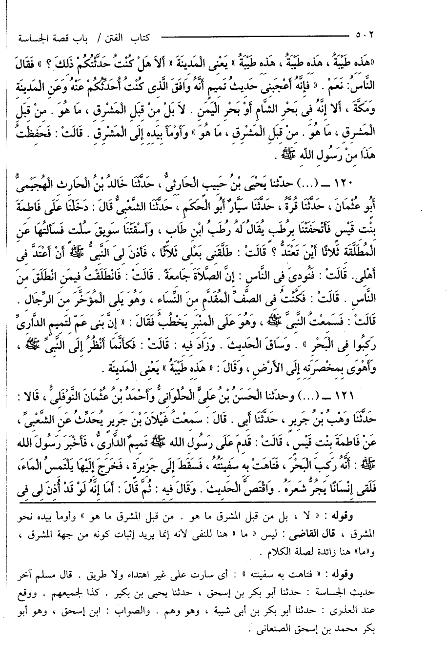121 - (...) وحدّثنا الْحَسَنُ بْنُ عَلِىٍّ الْحُلْوَانِىُّ وَأَحْمَدُ بْنُ عُثْمَانَ النَّوْفَلِىُّ، قَالا: حَدَّثَنَا وَهْبُ بْنُ جَرِيرٍ، حَدَّثَنَا أَبِى. قَالَ: سَمِعْتُ غَيْلاَنَ بْنَ جَرِيرٍ يُحَدِّثُ عَنِ الشَّعْبِىِّ، عَنْ فَاطِمَةَ بِنْتِ قَيْسٍ، قَالَتْ: قَدِمَ عَلَى رَسُولِ الله صَلَّى اللَّهُ عَلَيْهِ وَسَلَّمَ تَمِيمٌ الدَّارِىُّ، فَأَخْبَرَ رَسُولَ الله صَلَّى اللَّهُ عَلَيْهِ وَسَلَّمَ: أً نَّهُ رَكِبَ الْبَحْرَ، فَتَاهَتْ بِهِ سَفِينَتُهُ، فَسَقَطَ إِلَى جَزِيرَةٍ، فَخَرَجَ إلَيْهَا يَلْتَمِسُ الْمَاءَ، فَلَقى إِنْسَانًا يَجُرُّ شَعرَهُ. وَاقْتَصَّ الْحَدِيثَ. وَقَالَ فِيهِ: ثُمَّ قَالَ: أَمَا إِنَّهُ لَوْ قَدْ أُذِنَ لِى فِى