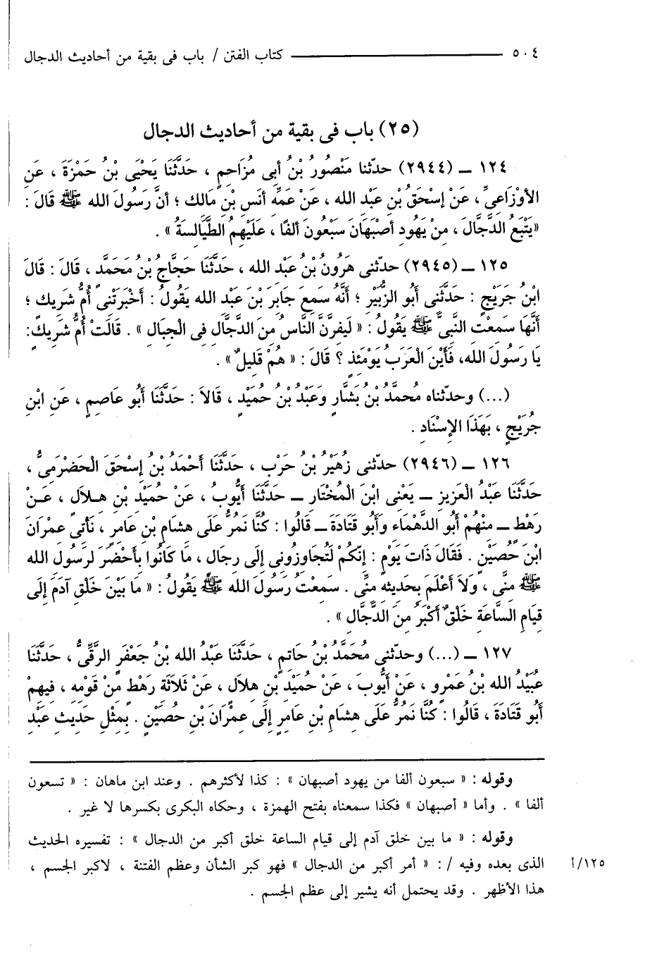 126 - (2946) حدّثنى زُهَيْرُ بْنُ حَرْبٍ، حَدَّثَنَا أَحْمَدُ بْنُ إِسْحَاقَ الْحَضْرَمِىُّ، حَدَّثَنَا عَبْدُ الْعَزيزِ - يَعْنِى ابْنَ الْمُخْتَارِ - حَدَّثَنَا أَيُّوبُ، عَنْ حُمَيْدِ بْنِ هِلاَلٍ، عَنْ رَهْطٍ - مِنْهُمْ أَبُو الدَّهْمَاءِ وَأَبُو قَتَادَةَ - قَالُوا: كُنَّا نَمُرُّ عَلَى هِشَامِ بْنِ عَامِرٍ، نَأَتِى عِمْرَانَ ابْنَ حُصَيْنٍ. فَقَالَ ذَاتَ يَوْمٍ: إِنّكُمْ لَتُجَاوِزُونِى إِلَى رِجَالٍ، مَا كَانُوا بِأَحْضَرَ لِرَسُولَ الله صَلَّى اللَّهُ عَلَيْهِ وَسَلَّمَ مِنَّى، وَلاَ أَعْلَمَ بِحَدِيثهِ مِنِّى. سَمِعْتُ رَسُولَ الله صَلَّى اللَّهُ عَلَيْهِ وَسَلَّمَ يَقُولُ: " مَا بَيْنَ خَلْقِ آدَمَ إِلَى قِيَامِ السَّاعَةِ خَلْقٌ أَكْبَرُ مِنَ الدَّجَّالِ ".