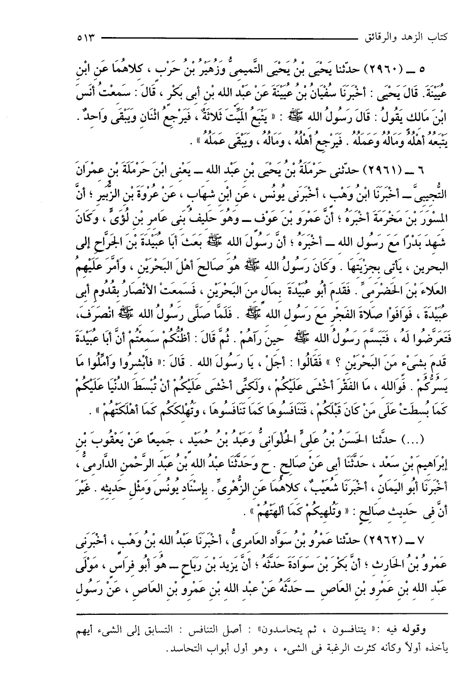 6 - (2961) حدّثنى حَرْمَلَةُ بْنُ يَحْيَى بْنِ عَبْدِ اللهِ - يَعْنِى ابْنَ حَرْمَلَةَ بْنِ عِمْرَانَ التُّجِيبِىَّ - أَخْبَرَنَا ابْنُ وَهْبٍ، أخْبَرَنى يُونُس، عَنِ ابْنِ شِهَابٍ، عَنْ عُرْوَةَ بْنِ الزُّبَيرِ؛ أنَّ المِسْوَرَ بْنَ مَخْرَمَةَ أخْبَرَهُ؛ أَنَّ عَمْرَو بْنَ عَوْفٍ - وَهُوَ حَلِيفُ بَنِى عَامِرِ بْنِ لُؤَىٍّ، وَكَانَ شَهِدَ بَدْرًا مَعَ رَسُولِ اللهِ - أخْبَرَهُ؛ أنَّ رَسُولَ اللهِ صَلَّى اللَّهُ عَلَيْهِ وَسَلَّمَ بَعَثَ أَبَا عُبَيْدَةَ بْنَ الجَرَّاحِ إلى البحرين، يَأتِى بِجِزْيَتِهَا. وَكَانَ رَسُولُ اللهِ صَلَّى اللَّهُ عَلَيْهِ وَسَلَّمَ هُوَ صَالحَ أَهْلَ البَحْرَيْنِ، وَأمَّرَ عَلَيْهِمُ العَلاءَ بْنَ الحَضْرَمِىِّ. فَقَدِمَ أَبُو عُبَيْدَةَ بِمَالَ مِنَ البَحْرَيْنِ، فَسَمِعَتْ الأنْصَارُ بِقُدُومِ أبِى عُبَيْدَةَ، فَوَافَوْا صَلاةَ الفَجْرِ مَعَ رَسُولِ اللهِ صَلَّى اللَّهُ عَلَيْهِ وَسَلَّمَ. فَلَمَّا صَلَّى رَسُولُ اللهِ صَلَّى اللَّهُ عَلَيْهِ وَسَلَّمَ انْصَرَفَ، فَتَعَرَّضُوا لَهُ، فَتَبَسَّمَ رَسُولُ اللهِ صَلَّى اللَّهُ عَلَيْهِ وَسَلَّمَ حِينَ رآهُمْ. ثُمَّ قَالَ: أظُنُّكُمْ سَمِعْتُمْ أنَّ أَبَا عُبَيْدَةَ قَدِمَ بِشَىْءٍ منَ البَحْرَيْنِ؟ " فَقَالُوا: أجَلْ، يَا رَسُولَ اللهِ. قَالَ: " فأَبْشِرُوا وَأمِّلُوا مَا يَسُرُّكُمْ. فَوَاللهِ، مَا الفَقْرَ أخْشَى عَلَيْكُمْ، وَلَكِنِّى أخْشَى عَلَيْكُمْ أنْ تُبْسَطَ الدُّنْيَا عَلَيْكُمْ كَمَا بُسِطَتْ عَلَى مَنْ كَانَ قَبْلَكُمْ، فَتَنَافَسُوهَا كَمَا تَنَافَسُوهَا، وَتُهْلِكَكُم كَمَا أهْلَكَتْهُمْ ".