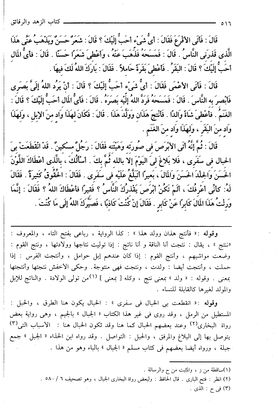 قَالَ: ثُمَّ إنَّهُ أتَى الأبْرَصَ فِى صُورَتِهِ وَهَيْئَتِهِ فَقَالَ: رَجُلٌ مِسْكِينٌ. قَدْ انْقَطَعَتْ بِىَ الحِبال فِى سَفَرِى، فَلا بَلاغَ لِىَ اليَوْمَ إلا باللهِ ثُمَّ بِكَ. أسْألُكَ، بِالَّذِى أعْطَاكَ اللَّوْنَ الحَسَنَ وَالجِلْدَ الحَسَنَ وَالمَالَ، بَعِيرًا أتَبَلَّغُ عَلَيْهِ فِى سَفَرِى. فَقَالَ: الَحُقُوقُ كَثِيرَةٌ. فَقَالَ لَهُ: كأنِّى أعْرِفُكَ، ألَمْ تَكُنْ أبْرَصَ يَقْذِرُكَ النَّاسُ؟ فَقِيرًا فأعْطَاكَ اللهُ؟ فَقَالَ: إنَّمَا وَرِثْتُ هَذَا المَالَ كَابِرًا عَنْ كَابِرٍ. فَقَالَ إنْ كُنْتَ كَاذِبًا، فَصَيَّرَكَ اللهُ إلَى مَا كُنْتَ.