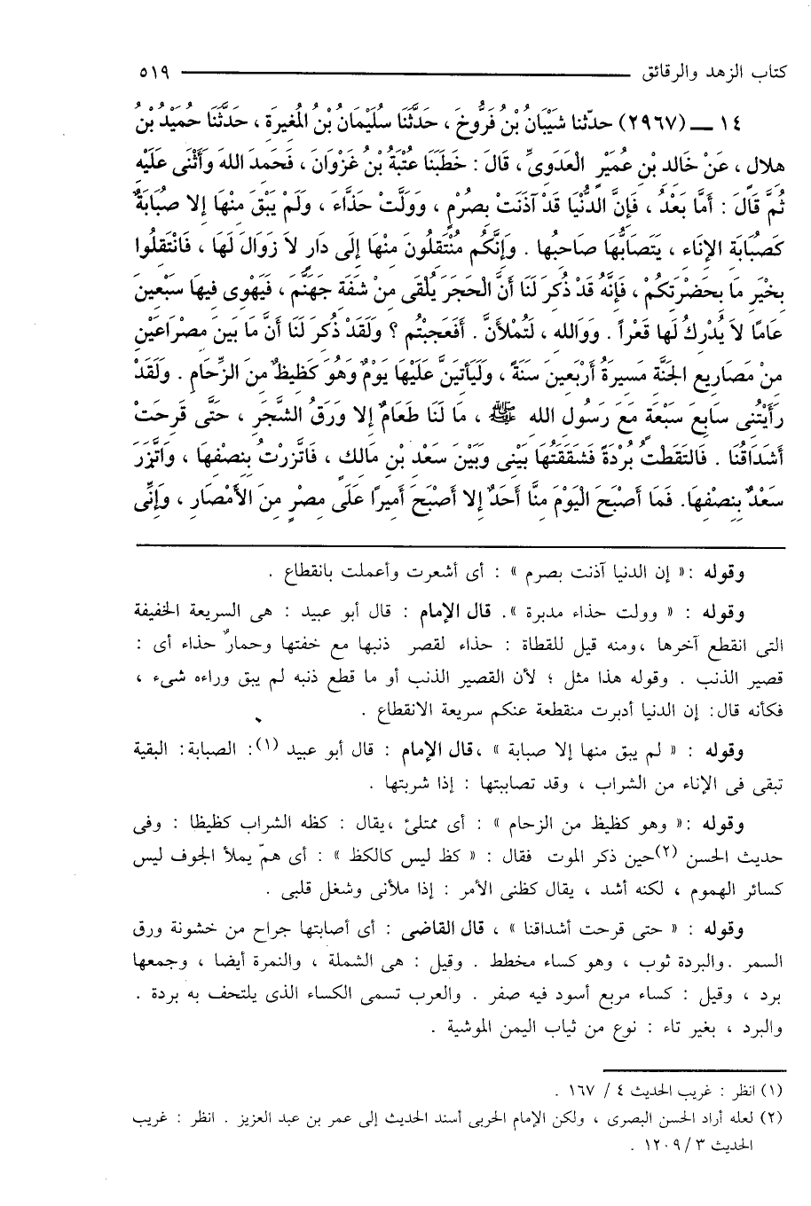 14 - (2967) حدّثنا شَيْبَانُ بْنُ فَرُّوخَ، حَدَّثَنَا سُلَيْمَانُ بْنُ المُغِيرَةِ، حَدَّثَنَا حُمَيْدُ بْنُ هِلالٍ، عَنْ خَالِدِ بْنِ عُمَيْرٍ الْعَدَوِىِّ، قَالَ: خَطَبَنَا عُتْبَةُ بْنُ غَزْوَانَ، فَحَمِدَ اللهَ وَأَثْنَى عَلَيْهِ ثُمَّ قَالَ: أَمَّا بَعْدُ، فَإِنَّ الدُّنْيَا قَدْ آذَنَتْ بصُرْمٍ، وَوَلَّتْ حَذَّاءَ، وَلَمْ يَبْقَ مِنْهَا إِلا صُبَابَةٌ كَصُبَابَةِ الإِنَاءِ، يَتَصَابُّهَا صَاحِبُها. وَإِنَّكُم مُنْتَقلُونَ مِنْهَا إِلَى دَارٍ لاَ زَوَالَ لَهَا، فَانْتَقِلُوا بِخْيَرِ مَا بِحَضْرَتِكُمْ، فَإِنَّهُ قَدْ ذُكِرَ لَنَا أَنَّ الْحَجَرَ يُلْقَى مِنْ شَفَةِ جَهَنَّمَ، فَيَهْوِى فِيهَا سَبْعِينَ عَامًا لاَ يُدْرِكُ لَها قَعْراً. وَوَاللهِ، لَتُمْلأَنَّ. أَفَعَجبْتُم؟ وَلَقَدْ ذُكِرَ لَنَا أَنَّ مَا بَينَ مصْرَاعَيْنِ مِنْ مَصَارِيع الجَنَّةِ مَسِيرَةُ أَرْبَعِينَ سَنَةً، وَلَيَأتِيَنَّ عَلَيْهَا يَوْمٌ وَهُوَ كَظِيظٌ مِنَ الزِّحَامِ. وَلَقَدْ رَأَيْتُنِى سَابِعَ سَبْعَةٍ مَعَ رَسُولَ اللهِ صَلَّى اللَّهُ عَلَيْهِ وَسَلَّمَ، مَا لَنَا طَعَامٌ إِلا وَرَقُ الشَّجَرِ، حَتَّى قَرِحَتْ أَشَدَاقُنَا. فَالتَقَطْتُ بُرْدَةً فَشَقَقَتُهَاَ بَيْنِى وَبَيْنَ سَعْدِ بْنِ مَالِكٍ، فَاتَّزرْتُ بِنِصْفِهَا، وَاتَّزَرَ سَعْدٌ بِنِصْفِهَا. فَمَا أَصْبَحَ الْيَوْمَ مِنَّا أَحَدٌ إِلا أَصْبَحَ أَمِيرًا عَلَى مِصْرٍ مِنَ الأَمْصَارِ، وَإِنِّى