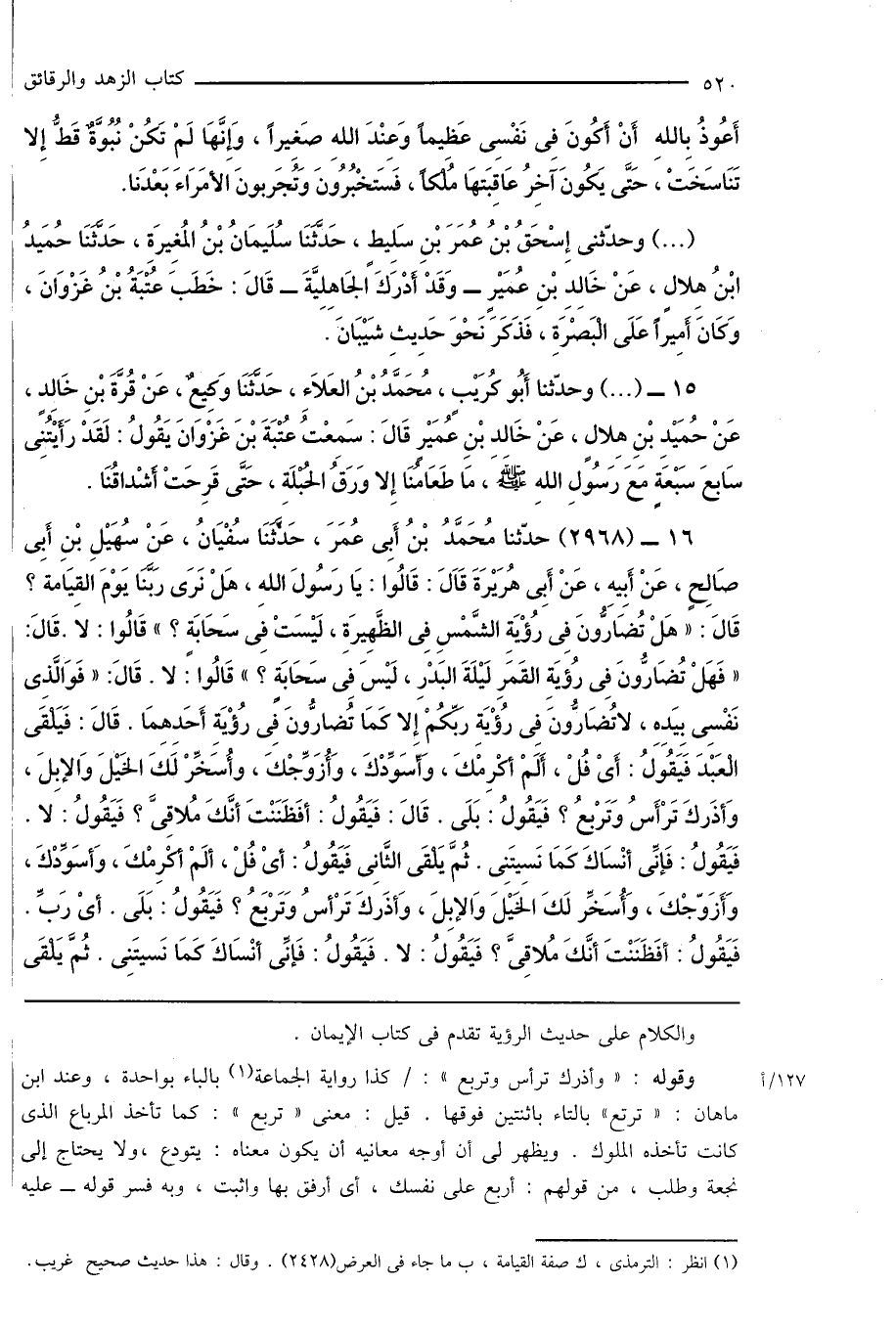 16 - (2968) حدّثنا مُحَمَّدُ بْنُ أَبِى عُمَرَ، حَدَّثَنَا سُفْيَانُ، عَنْ سُهَيْلِ بْنِ أَبِى صَالِحٍ، عَنْ أَبِيهِ، عَنْ أَبِى هُرَيْرَةَ قَاَلَ: قَالُوا: يَا رَسُولَ اللهِ، هَلْ نَرَى رَبَّنَا يَوْمَ القِيَامة؟ قَالَ: " هَلْ تُضَارُّونَ فِى رُؤْيَةِ الشَّمْسِ فِى الظَّهِيرَةِ، لَيْسَتْ فِى سَحَابَةٍ؟ " قَالُوا: لا. قَالَ: " فَهَلْ تُضَارُّونَ فِى رُؤيَةِ القَمَرِ لَيْلَةَ البَدْرِ، لَيْسَ فِى سَحَابَةٍ؟ " قَالُوا " لا. قَالَ: " فَوَالَّذِى نَفْسِى بِيَدِهِ، لا تُضَارُّونَ فِى رُؤْيَةِ رَبِّكُمْ إِلا كَمَا تُضارُّونَ فِى رُؤْيَةِ أَحَدِهِمَا. قَالَ: فَيَلْقَى الْعَبْدَ فَيَقُولُ: أَىْ فُلْ، أَلَمْ أكْرِمْكَ، وَأسَوِّدْكَ، وَأُزَوِّجْكَ، وأُسَخِّرْ لَكَ الخَيْلَ وَالإبِلَ، وَأذَركَ تَرْأَسُ وَتَرْبعُ؟ فَيَقُولُ: بَلَى. قَالَ: فَيَقُولُ: أفَظَنَنْتَ أنَّكَ مُلاقِىَّ؟ فَيَقُولُ: لا. فَيَقُولُ: فَإنِّى أنْسَاكَ كَمَا نَسِيتَنِى، ثُمَّ يَلْقَى الثَّانِى فَيَقُولُ: أىْ فُلْ، ألَمْ أكْرِمْكَ، وَأسَوِّدْكَ، وَأَزَوّجْكَ، وَأُسَخِّر لَكَ الخَيْلَ وَالإبِلَ، وَأذَركَ تَرْأسُ وَتَرْبَعُ؟ فَيَقُولُ: بَلَى. أىْ رَبِّ. فَيَقُولُ: أفَظَنَنْتَ أنَّكَ مُلاقِىَّ؟ فَيَقُولُ: لا. فَبَقُولُ: فَإنِّى أنْسَاكَ كَمَا نَسيتَنِى. ثُمَّ يَلْقَى
