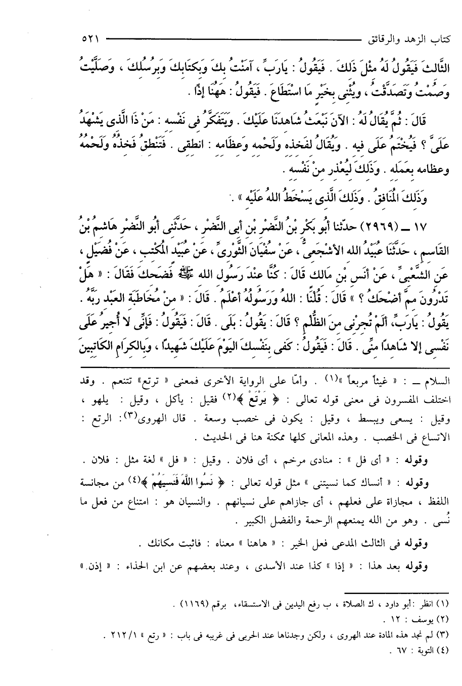 17 - (2969) حدّثنا أَبُو بَكْرِ بْنُ النَّضْرِ بْنِ أبِى النَّضْرِ، حَدَّثَنِى أَبُو النَّضْرِ هَاشِمُ بْنُ القَاسِمِ، حَدَّثَنَا عُبَيْدُ اللهِ الأشْجَعِىُّ، عَنْ سُفْيَانَ الثَّوْرِىِّ، عَنْ عُبَيْدٍ المُكْتِبِ، عَنْ فُضَيْلٍ، عَنِ الشَّعْبِىِّ، عَنْ أنَسِ بْنِ مَالِكٍ قَالَ: كُنَّا عِنْدَ رَسُولِ اللهِ صَلَّى اللَّهُ عَلَيْهِ وَسَلَّمَ فَضَحِكَ فَقَالَ: " هَلْ تَدْرُونَ مِمَّ أضْحَكُ؟ " قَالَ: قُلْنَا: اللهُ وَرَسُولُهُ أعْلَمُ. قَالَ: " مِنْ مُخَاطَبَةِ العَبْدِ رَبَّهُ. يَقُولُ: يَارَبِّ، ألَمْ تُجِرْنِى مِنَ الظُّلْمِ؟ قَالَ: يَقُولُ: بَلَى. قَالَ: فَيَقُولُ: فَإنِّى لا أُجِيرُ عَلَى نَفْسِى إلا شَاهِدًا مِنِّى. قَالَ: فَيَقُولُ: كَفى بِنَفْسِكَ اليَوْمَ عَلَيْكَ شَهِيدًا، وَبِالكِرَامِ الكَاتِبِينَ