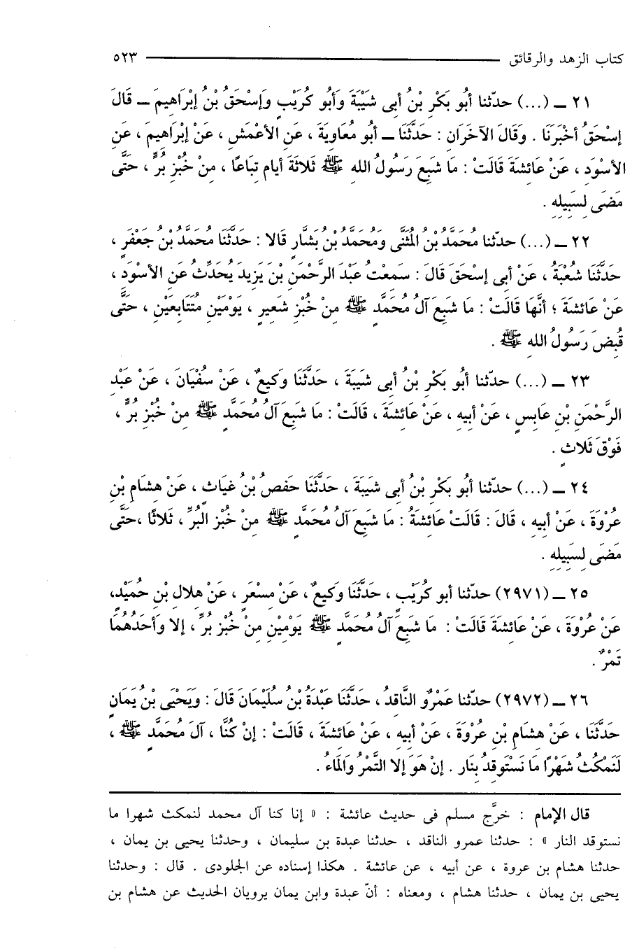 24 - (...) حدّثنا أَبُو بَكْرِ بْنُ أبِى شَيبَةَ، حَدَّثَنَا حَفصُ بْنُ غِيَاثٍ، عَنْ هِشَامِ بْنِ عُرْوَةَ، عَنْ أبِيهِ، قَالَ: قَالَتْ عَائِشَةُ: مَا شَبِعَ آلُ مُحَمَّدٍ صَلَّى اللَّهُ عَلَيْهِ وَسَلَّمَ مِنْ خُبْز البُرِّ، ثَلاثًا، حَتَّى مَضَى لِسَبِيلِهِ.