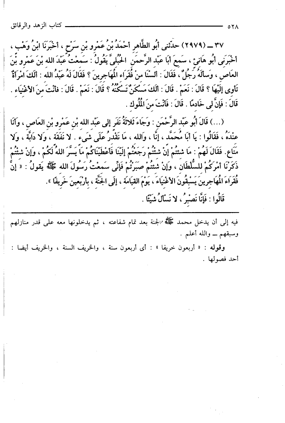 (...) قَالَ أَبُو عَبْدِ الرَّحْمَنِ: وَجَاءَ ثَلاثَةُ نَفَرٍ إلى عَبْدِ اللهِ بْنِ عَمْرِو بْنِ العَاصِ، وَأنَا عِنْدَهُ، فَقَالُوا: يَا أَبَا مُحَمَّدٍ، إنَّا، وَاللهِ، مَا نَقْدِرُ عَلَى شَىءٍ. لا نَفَقَة، وَلا دَابَّة، وَلا مَتَاع. فَقَالَ لَهُمْ: مَا شِئتُمْ إنْ شِئْتُمْ رَجَعْتُمْ إلَيْنَا فَأعْطَيْنَاكُمْ مَا يَسَّرَ اللهُ لَكُمْ، وَإنْ شِئْتُمْ ذَكَرْنَا أمْرَكُمْ لِلسُّلْطَانِ، وَإنْ شِئتُمْ صَبَرْتُمْ فَإنِّى سَمِعْتُ رَسُولَ اللهِ صَلَّى اللَّهُ عَلَيْهِ وَسَلَّمَ يَقولُ: " إنَّ فُقَرَاءَ المُهَاجِرينَ يَسْبِقُونَ الأغْنِيَاءَ، يَوْمَ القِيَامَةِ، إلَى الجَنَّةِ، بِأرْبَعِينَ خَرِيفًا ".