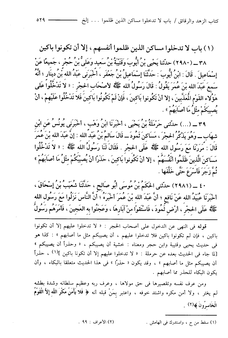 39 - (...) حدّثنى حَرْمَلَةُ بْنُ يَحْيَى، أَخْبَرَنَا ابْنُ وَهْبٍ، أخْبَرَنِى يُونُسُ عَنِ ابْنِ شِهَابٍ - وَهُوَ يَذْكُرُ الحِجْرَ، مَسَاكِنَ ثَمُودَ - قَالَ سَالِمُ بْنُ عَبْدَ اللهِ: إنَّ عَبْدَ اللهِ بْنَ عُمَرَ قَالَ: مَرَرْنَا مَعَ رَسُولِ اللهِ صَلَّى اللَّهُ عَلَيْهِ وَسَلَّمَ عَلَى الحِجْرِ. فَقَالَ لَنَا رَسُولُ اللهِ صَلَّى اللَّهُ عَلَيْهِ وَسَلَّمَ: " لاَ تَدْخُلُوا مَسَاكِنَ الَّذِينَ ظَلَمُوا أنْفُسَهُمْ، إلا أنْ تَكُونوا بَاكِينَ، حَذَرًا أنْ يُصِيْبَكُمْ مِثْلُ مَا أصَابَهُمْ " ثُمَّ زَجَرَ فَأسْرَعَ حَتَّى خَلَّفَها.