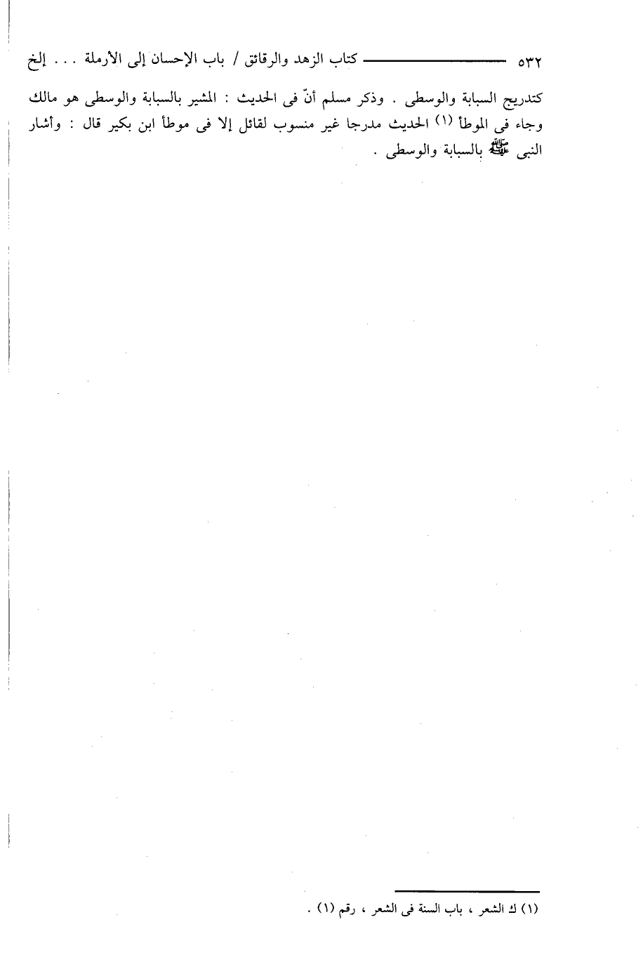كتدريج السبابة والوسطى. وذكر مسلم أنّ فى الحديث: المشير بالسبابة والوسطى هو مالك وجاء فى الموطأ (¬1) الحديث مدرجاً غير منسوب لقائل إلا فى موطأ ابن بكير قال: وأشار النبى صَلَّى اللَّهُ عَلَيْهِ وَسَلَّمَ بالسبابة والوسطى.