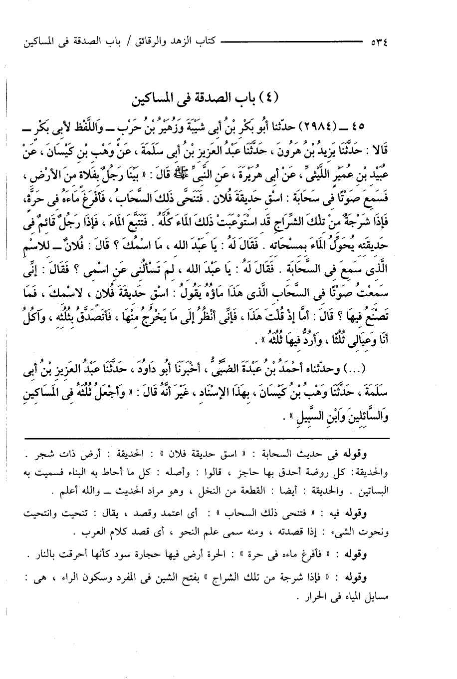 45 - (2984) حدّثنا أَبُو بَكْرِ بْنُ أبِى شَيْبَةَ وَزُهَيْرُ بْنُ حَرْبٍ - وَاللَّفْظ لأبِى بَكْرٍ - قَالا: حَدَّثَنَا يَزِيدُ بْنُ هَارُونَ، حَدَّثَنَا عَبْدُ العَزِيزِ بْنُ أبِى سَلَمَةَ، عَنْ وَهْبِ بْنِ كَيْسَانَ، عَنْ عُبَيْدِ بْنِ عُمَيْرٍ اللَّيْثىِّ، عَنْ أبِى هُرَيْرَةَ، عَنِ النَّبِىِّ صَلَّى اللَّهُ عَلَيْهِ وَسَلَّمَ قَالَ: " بَيْنَا رَجُلٌ بِفَلاةٍ مِنَ الأرْضِ، فَسَمِعَ صَوْتًا فِى سَحَابَة: اسْقِ حَدِيقَةَ فُلان. فَتَنَحَّى ذَلِكَ السَّحَابُ، فَأَفْرَغَ مَاءَهُ فِى حَرَّةٍ، فَإذَا شَرْجَةٌ مِنْ تِلْكَ الشِّرَاجِ قَدِ اسْتَوْعَبَتْ ذَلِكَ المَاءَ كُلَّهُ. فَتَتَبَّعَ المَاءَ، فَإذَا رَجُلٌ قَائِمٌ فِى حَدِيقَتِهِ يُحَوَّلُ المَاءَ بِمِسْحَاتِهِ. فَقَالَ لَهُ: يَا عَبْدَ اللهِ، مَا اسْمُكَ؟ قَالَ: فُلانٌ - لِلاسْمِ الَّذِى سَمِعَ فِى السَّحَابَةِ. فَقَالَ لَهُ: يَا عَبْدَ اللهِ، لِمَ تَسْألُنِى عَنِ اسْمِى؟ فَقَالَ: إنِّى سَمِعْتُ صَوْتًا فِى السَّحَاب الَّذى هَذَا مَاؤُهُ يَقُولُ: اسْقِ حَدِيقَةَ فُلانٍ، لاسْمِكَ، فَمَا تَصْنَعُ فِيهَا؟ قَالَ: أمَّا إذْ قُلْتَ هَذَا، فَإنِّى أنْظُرُ إلَى مَا يَخْرُجُ مِنْهَا، فَأتَصَدَّقُ بِثُلُثِهِ، وآكُلُ أنَا وَعِيَالِى ثُلُثًا، وَأرُدُّ فِيهَا ثُلُثَهُ ".