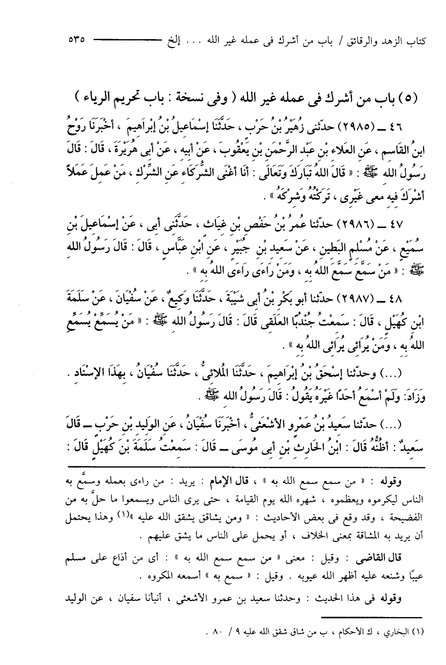 46 - (2985) حدّثنى زُهَيْرُ بْنُ حَرْبٍ، حَدَّثَنَا إسْمَاعِيلُ بْنُ إبْرَاهِيمَ، أَخْبَرَنَا رَوْحُ ابنُ القَاسِم، عَنِ العَلاءِ بْنِ عَبْدِ الرَّحْمَنِ بْنِ يَعْقُوبَ، عَنْ أبِيهِ، عَنْ أبِى هُرَيْرَةَ، قَالَ: قَالَ رَسُولُ اللهِ صَلَّى اللَّهُ عَلَيْهِ وَسَلَّمَ: " قَالَ اللهُ تَبَارَكَ وَتَعَالَى: أنَا أغْنَى الشُّرَكَاءِ عَنِ الشَّرْكِ، مَنْ عَمِلَ عَمَلاً أشْرَكَ فِيهِ معى غَيْرِى، تَرَكْتُهُ وَشِرْكَهُ ".