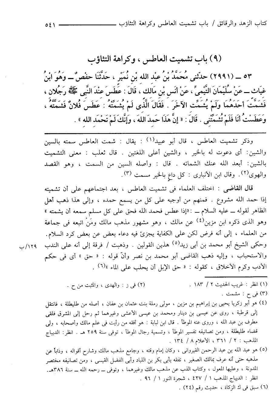 53 - (2991) حدّثنى مُحَمَّدُ بْنُ عبْدِ اللهِ بْنِ نُمَيْرٍ، حَدَّثَنَا حفْصٌ - وَهُوَ ابْنُ غِيَاثٍ - عَنْ سُلَيْمَانَ التَيْمِىِّ، عَنْ أنَسِ بْنِ مَالِكٍ، قَالَ: عَطَسَ عِنْدَ النَّبِى صَلَّى اللَّهُ عَلَيْهِ وَسَلَّمَ رَجُلانِ، فَشَمَّتَ أحَدَهُمَا وَلَمْ يُشَمِّتِ الآخَرَ. فَقَالَ الَّذِى لَمْ يُشَمِّتْهُ: عَطَسَ فُلانٌ فَشَمَّتَّهُ، وَعَطَسْتُ أنَا فَلَمْ تُشَمِّتْنِى. قَالَ: " إنَّ هَذَا حَمِدَ اللهَ، وَإنَّكَ لَمْ تَحْمَدِ اللهِ ".