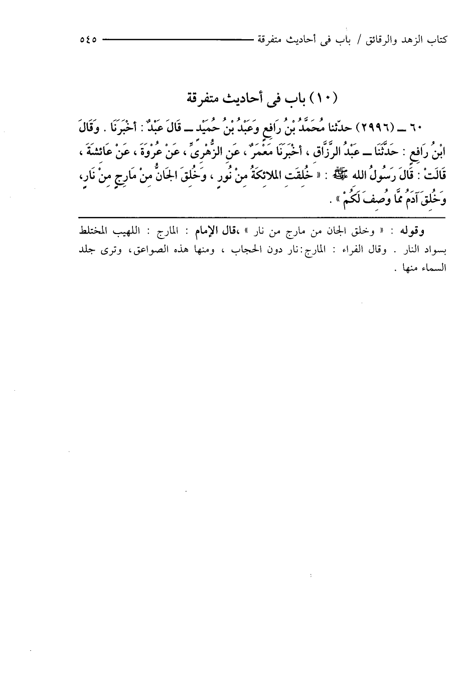 60 - (2996) حدّثنا مُحَمَّدُ بْنُ رَافِعٍ وَعَبْدُ بْنُ حُمَيْدٍ - قَالَ عَبْدٌ: أَخْبَرَنَا. وَقَالَ ابْنُ رَافِعٍ: حَدَّثَنَا - عَبْدُ الرَّزَّاقِ، أَخْبَرَنَا مَعْمَرٌ، عَنِ الزُّهْرِىِّ، عَنْ عُرْوَةَ، عَنْ عَائِشَةَ، قَالَتْ: قَالَ رَسُولُ اللهِ صَلَّى اللَّهُ عَلَيْهِ وَسَلَّمَ: " خُلِقَتِ الملائِكَةُ مِنْ نُورٍ، وَخُلِقَ الجَانُّ مِنْ مَارِجٍ مِنْ نَارٍ، وَخُلِقَ آدَمُ ممَّا وُصِفَ لَكُمْ ".