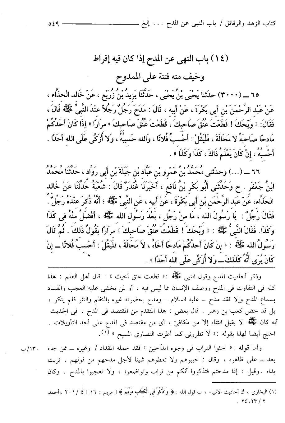 65 - (3000) حدّثنا يَحْيَى بْنُ يَحْيَى، حَدَّثَنَا يَزِيدُ بْنُ زُرَيْع، عَنْ خَالِد الْحذَّاءِ، عَنْ عَبْدِ الرَّحْمَنَ بْنِ أَبِى بَكْرَةَ، عَنْ أَبِيهِ، قَالَ: مَدَحَ رَجُلٌ رَجُلاً عِنْدَ النَّبِىِّ صَلَّى اللَّهُ عَلَيْهِ وَسَلَّمَ قَالَ، فَقَالَ: " وَيْحَكَ! قَطَعْتَ عُنُقَ صَاحِبِكَ، قَطَعْتَ عُنُقَ صَاحِبِكَ " مِرَارًا " إِذَا كَانَ أَحَدُكُمْ مَادِحًا صَاحِبَهُ لا مَحَالَةَ، فَلْيَقُلْ: أَحْسِبُ فُلانًا، وَالله حَسِيبُهُ، وَلا أُزَكِّى عَلَى اللهِ أحَدًا. أَحْسِبُهُ، إِنْ كَانَ يَعْلَمُ ذَاكَ، كَذَا وَكَذَا ".
