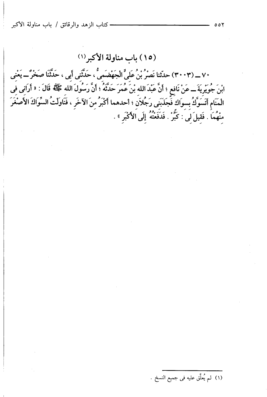 70 - (3003) حدّثنا نَصْرُ بْنُ عَلِىٍّ الْجَهْضَمِىُّ، حَدَّثَنِى أَبِى، حَدَّثَنَا صَخْرٌ - يَعْنِى ابْنَ جُوَيْرِيَةَ - عَنْ نَافِعٍ؛ أَنَّ عَبْدَ اللهِ بْنَ عُمَرَ حَدَّثَهُ؛ أَنَّ رَسُولَ اللهِ صَلَّى اللَّهُ عَلَيْهِ وَسَلَّمَ قَالَ: " أَرَانِى فِى الْمَنَامِ أَتَسَوَّكُ بِسِوَاكٍ فَجَذَبَنِى رَجُلاَنِ؛ أحدهما أَكْبَرُ مِنَ الآخَرِ، فَنَاوَلْتُ السِّوَاكَ الأَصْغَرَ مِنْهُمَا. فَقِيلَ لِى: كَبِّرْ. فَدَفَعْتُهُ إِلَى الأَكْبَرِ ".