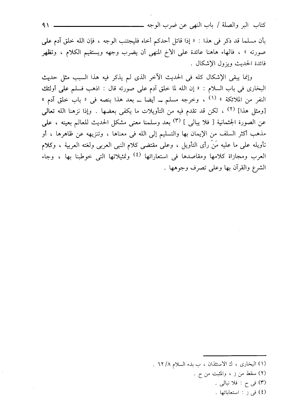 وإنما يبقى الإشكال كله فى الحديث الآخر الذى لم يذكر فيه هذا السبب مثل حديث البخارى فى باب السلام: " إن الله لما خلق آدم على صورته قال: اذهب فسلم على أولئك النفر من الملائكة " (¬1)، وخرجه مسلم - أيضاً - بعد هذا بنصه فى " باب خلق آدم " [ومثل هذا] (¬2)، لكن قد تقدم فيه من التأويلات ما يكفى بعضها. وإذا نزهنا الله تعالى عن الصورة الجثمانية [فلا يبالى] (¬3) بعد وسلمنا معنى مشكل الحديث للعالم بعينه، على مذهب أكثر السلف من الإيمان بها والتسليم إلى الله فى معناها، وتنزيهه عن ظاهرها، أو تأويله على ما عليه مَنْ رأى التأويل، وعلى مقتضى كلام النبى العربى ولغته العربية، وكلام العرب ومجازاة كلامها ومقاصدها فى استعاراتها (¬4) وتمثيلاًتها التى خوطبنا بها، وجاء الشرع والقرآن بها وعلى تصرف وجوهها.