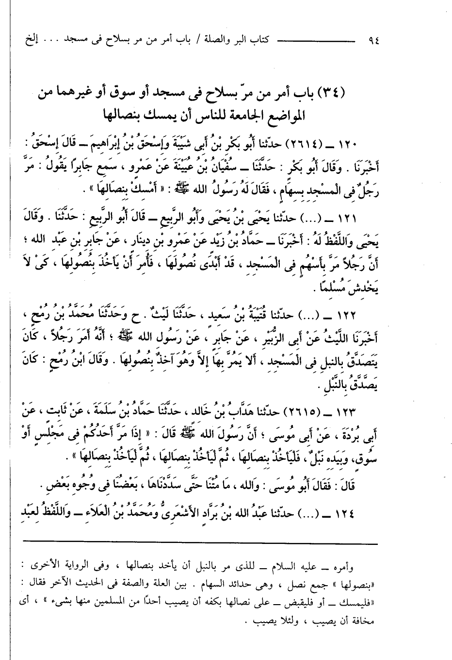 121 - (...) حَدَّثَنَا يَحْيَى بْنُ يَحْيَى وَأَبُو الرَّبِيعِ - قَالَ أَبُو الرَّبِيعِ: حَدَّثَنَا. وقَالَ يَحْيَى وَاللَّفْظُ لَهُ: أَخْبَرَنَا - حَمَّادُ بْنُ زَيْدٍ عَنْ عَمْرِو بْنِ دِينَارٍ، عَنْ جَابِرِ بْنِ عَبْدِ اللَّهِ؛ أَنَّ رَجُلًا مَرَّ بِأَسْهُمٍ فِى الْمَسْجِدِ، قَدْ أَبْدَى نُصُولَهَا، فَأُمِرَ أَنْ يَأْخُذَ بِنُصُولِهَا، كَىْ لَا يَخْدِشَ مُسْلِمًا.