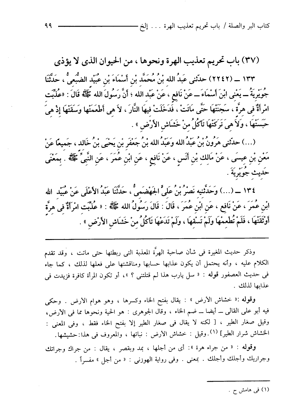 133 - (2242) حَدَّثَنِى عَبْدُ اللَّهِ بْنُ مُحَمَّدِ بْنِ أَسْمَاءَ بْنِ عُبَيْدٍ الضُّبَعِىُّ، حَدَّثَنَا جُوَيْرِيَةُ - يَعْنِى ابْنَ أَسْمَاءَ - عَنْ نَافِعٍ، عَنْ عَبْدِ اللَّهِ؛ أَنَّ رَسُولَ اللَّهِ صَلَّى اللَّهُ عَلَيْهِ وَسَلَّمَ قَالَ: " عُذِّبَتْ امْرَأَةٌ فِى هِرَّةٍ، سَجَنَتْهَا حَتَّى مَاتَتْ، فَدَخَلَتْ فِيهَا النَّارَ، لَا هِيَ أَطْعَمَتْهَا وَسَقَتْهَا إِذْ هِىَ حَبَسَتْهَا، وَلَا هِىَ تَرَكَتْهَا تَأْكُلُ مِنْ خَشَاشِ الْأَرْضِ ".