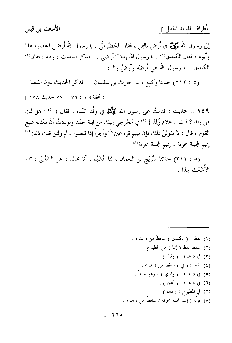 149 - حديث قدمت على رسول الله صَلَّى اللَّهُ عَلَيْهِ وَسَلَّمَ في وفد كندة فقال لي هل لك من ولد قلت غلام ولد لي في مخرجي إليك من ابنة جمد ولوددت أن مكانه شبع القوم قال لا تقولن ذلك فإن فيهم قرة عين وأجرا إذا قبضوا ثم ولئن قلت ذلك إنهم لمجبنة محزنة إنهم لمجبنة محزنة. (5: 211) حدثنا سريج بن النعمان ثنا هشيم أنا مجالد عن الشعبي ثنا الأشعث بهذا.