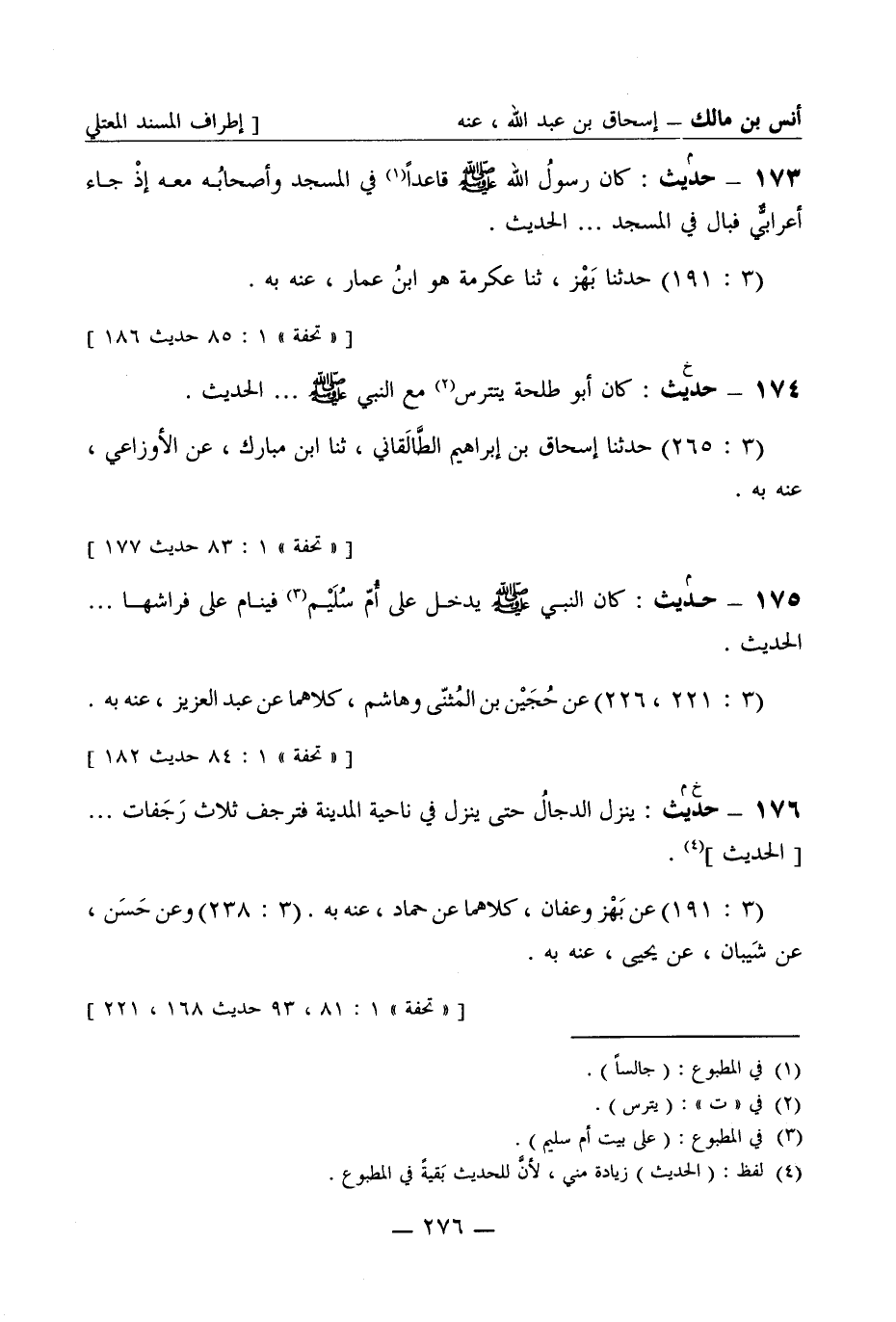 176 -[خ م] حديث ينزل الدجال حتى ينزل في ناحية المدينة فترجف ثلاث رجفات ... . الحديث (3: 191) عن بهز وعفان كلاهما عن حماد عنه به (3: 238) وعن حسن عن شيبان عن يحيى عنه به