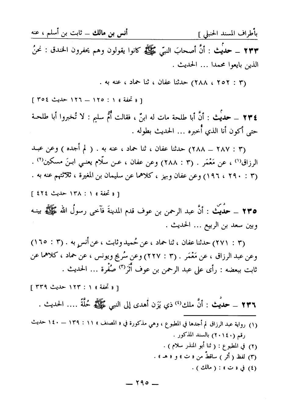 235 -[د س] حديث أن عبد الرحمن بن عوف قدم المدينة فآخى رسول الله صَلَّى اللَّهُ عَلَيْهِ وَسَلَّمَ بينه وبين سعد بن الربيع ... . الحديث (3: 271) حدثنا عفان ثنا حماد عن حميد وثابت عن أنس به (3: 165) وعن عبد الرزاق عن معمر (3: 227) وعن سريج ويونس عن حماد كلاهما عن ثابت ببعضه رأى على عبد الرحمن بن عوف أثر صفرة ... الحديث