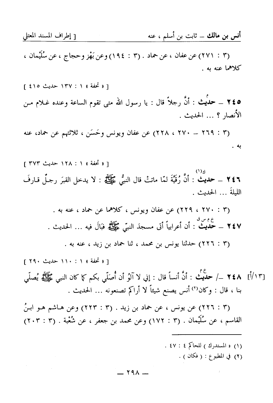 245 -[م] حديث أن رجلا قال يا رسول الله متى تقوم الساعة وعنده غلام من الأنصار ... . الحديث (3: 269 - 270، 228) عن عفان ويونس وحسن ثلاثتهم عن حماد عنه به