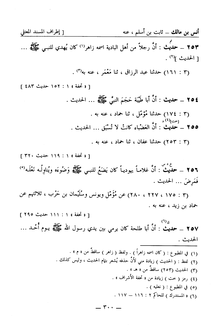 256 -[خ د س] حديث أن غلاما يهوديا كان يضع للنبي صَلَّى اللَّهُ عَلَيْهِ وَسَلَّمَ وضوءه ويناوله نعله فمرض ... . الحديث (3: 175، 227، 280) عن مؤمل ويونس وسليمان بن حرب ثلاثتهم عن حماد بن زيد عنه به
