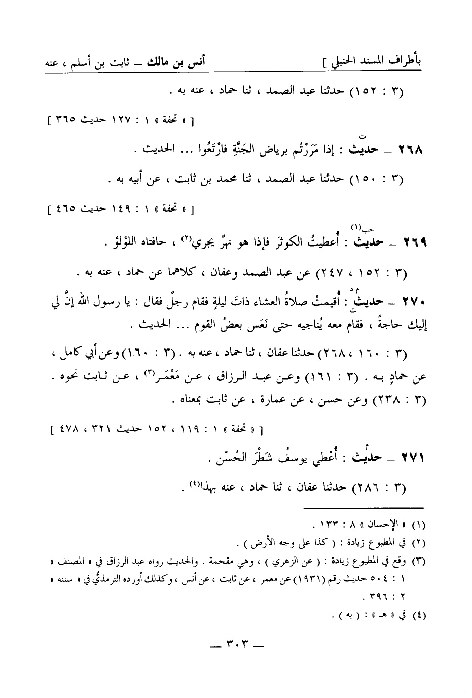 269 -[حب] حديث أعطيت الكوثر فإذا هو نهر يجري حافتاه اللؤلؤ (3: 152، 247) عن عبد الصمد وعفان كلاهما عن حماد عنه به