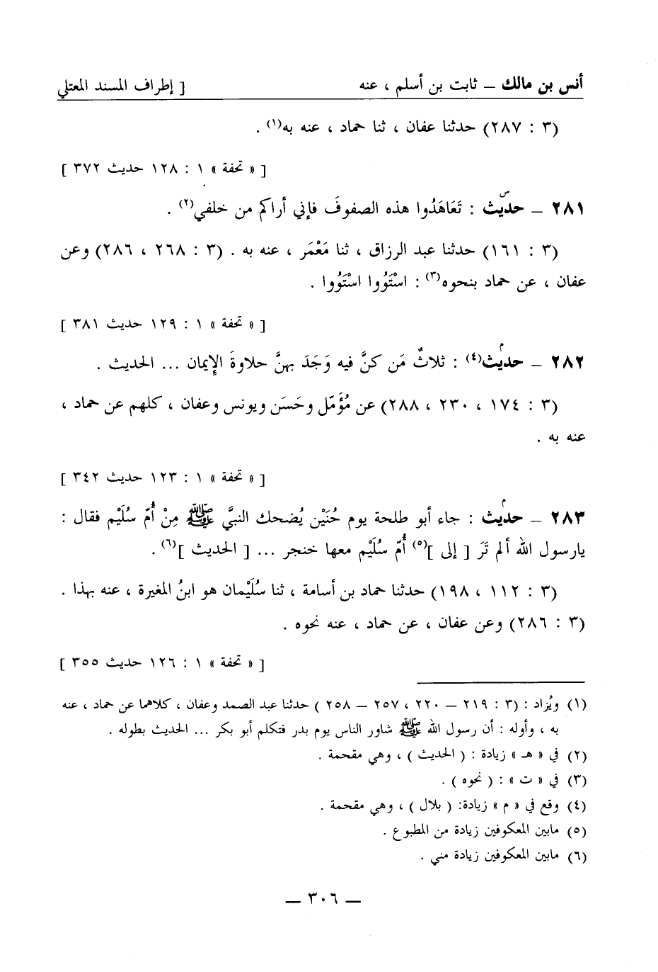 283 -[م] حديث جاء أبو طلحة يوم حنين يضحك النبي صَلَّى اللَّهُ عَلَيْهِ وَسَلَّمَ من أم سليم فقال يا رسول الله ألم تر إلى أم سليم معها خنجر ... . الحديث (3: 112، 198) حدثنا حماد بن أسامة ثنا سليمان هو ابن المغيرة عنه بهذا (3: 286) وعن عفان عن حماد عنه نحوه.