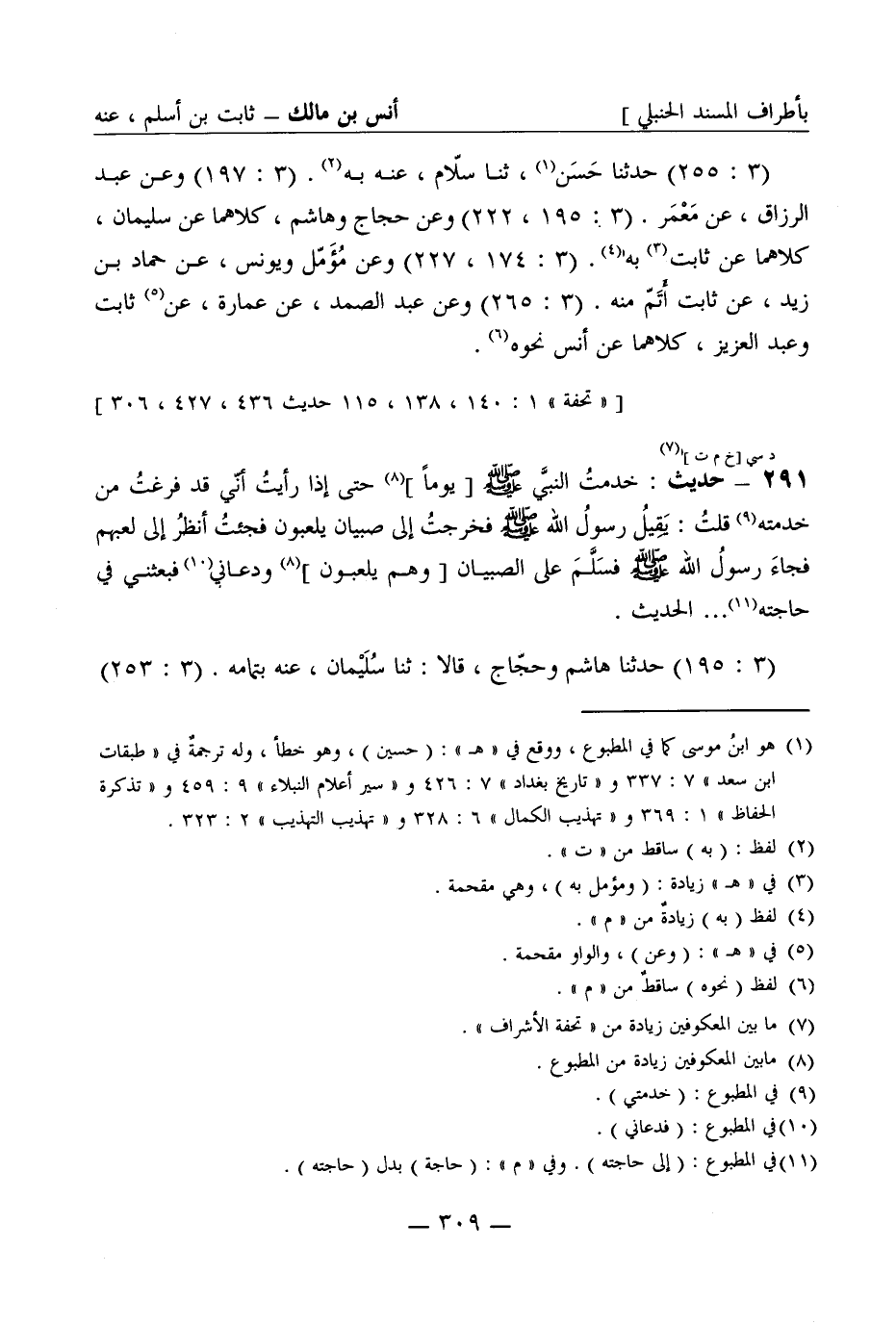 291 - (د سي خ م ت) حديث خدمت النبي صَلَّى اللَّهُ عَلَيْهِ وَسَلَّمَ يوما حتى إذا رأيت أني قد فرغت من خدمته قلت يقيل رسول الله صَلَّى اللَّهُ عَلَيْهِ وَسَلَّمَ فخرجت إلى صبيان يلعبون فجئت أنظر إلى لعبهم فجاء رسول الله صَلَّى اللَّهُ عَلَيْهِ وَسَلَّمَ فسلم على الصبيان وهم يلعبون ودعاني فبعثني في حاجته ... . الحديث (3: 195) حدثنا هاشم وحجاج قالا ثنا سليمان عنه بتمامه -[310]- (3: 253) وعن عفان عن حماد عنه نحوه (3: 131) وعن محمد بن جعفر عن شعبة عن سيار عن ثابت مختصر جدا وقد تقدم (ح 214)