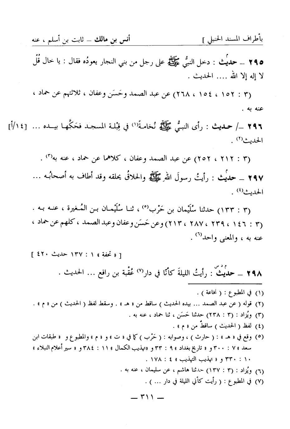 295 -[م] حديث دخل النبي صَلَّى اللَّهُ عَلَيْهِ وَسَلَّمَ على رجل من بني النجار يعوده فقال يا خال قل لا إله إلا الله ... . الحديث (3: 152، 154، 268) عن عبد الصمد وحسن وعفان ثلاثتهم عن حماد عنه به