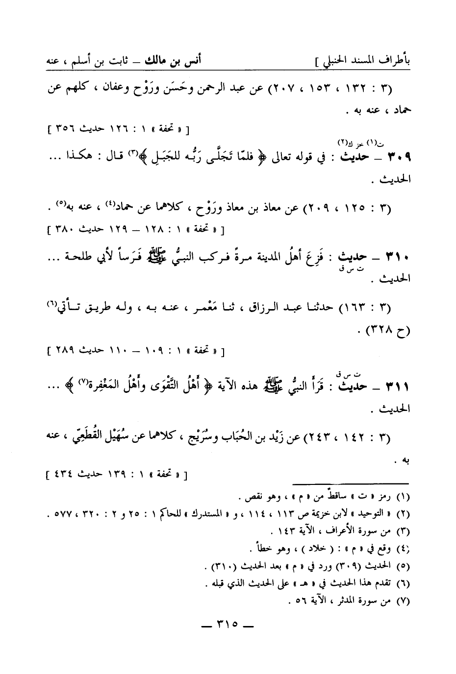 311 -[ت س ق] حديث قرأ النبي صَلَّى اللَّهُ عَلَيْهِ وَسَلَّمَ هذه الآية أهل التقوى وأهل المغفرة ... . الحديث (3: 142، 243) عن زيد بن الحباب وسريج كلاهما عن سهيل القطعي عنه به