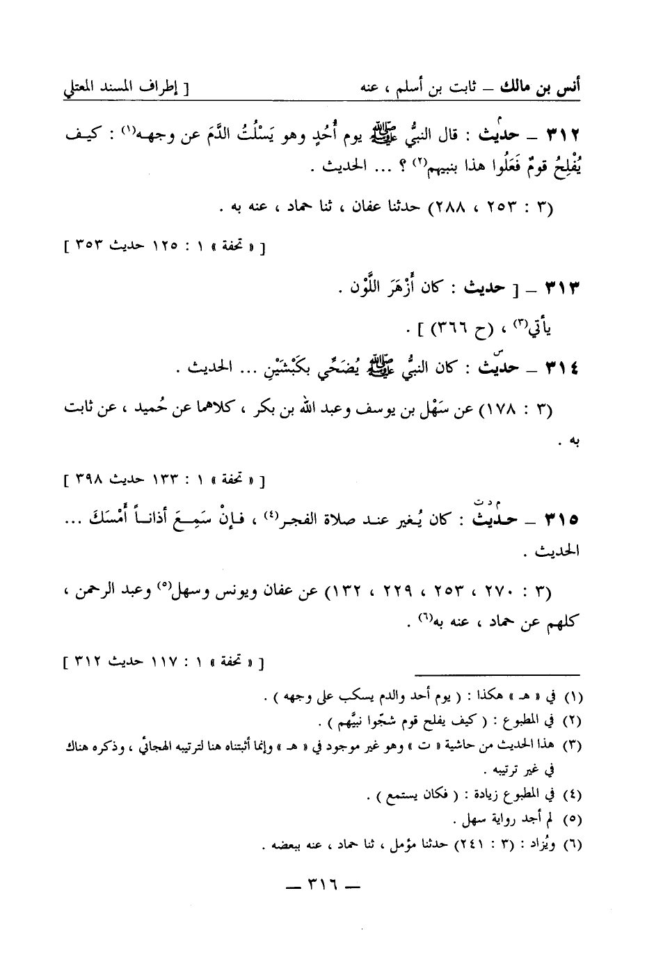 315 -[م د ت] حديث كان يغير عند صلاة الفجر فإن سمع أذانا أمسك..... الحديث (3: 270، 253، 229، 132) عن عفان ويونس وسهل وعبد الرحمن كلهم عن حماد عنه به