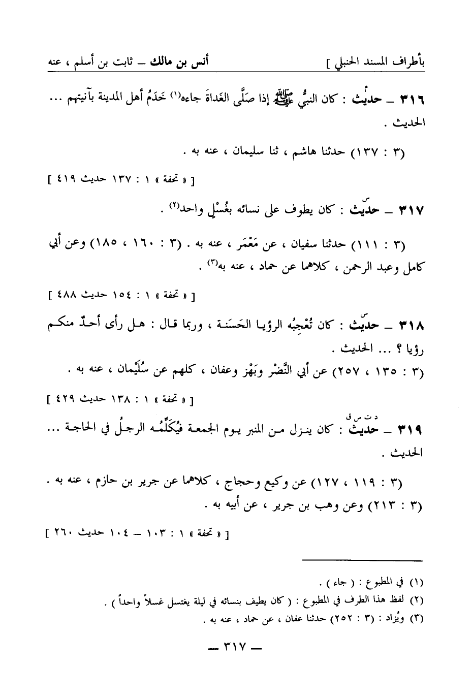 317 -[س] حديث كان يطوف على نسائه بغسل واحد (3: 111) حدثنا سفيان عن معمر عنه به (3: 160، 185) وعن أبي كامل وعبد الرحمن كلاهما عن حماد عنه به