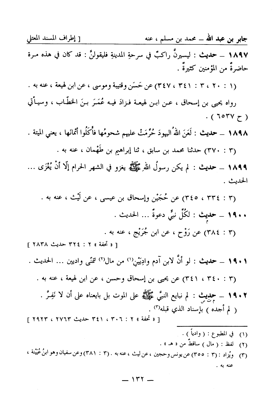 1899 - حديث: لم يكن رسول الله صَلَّى اللَّهُ عَلَيْهِ وَسَلَّمَ يغزو في الشهر الحرام إلا أن يغزى..... الحديث (3: 334، 345) عن حجين وإسحاق بن عيسى عن ليث عنه به
