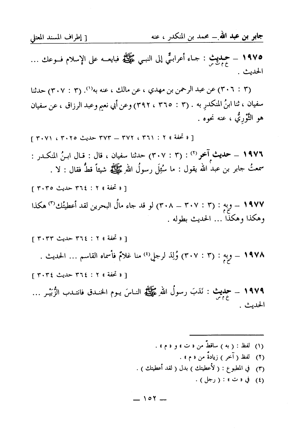 1975 -[خ م ت س] حديث: جاء أعرابي إلى النبي صَلَّى اللَّهُ عَلَيْهِ وَسَلَّمَ فبايعه على الإسلام فوعك..... الحديث (3: 306) عن عبد الرحمن بن مهدي عن مالك عنه به (3: 307) حدثنا سفيان ثنا ابن المنكدر به (3: 365، 392) وعن أبي نعيم وعبد الرزاق عن سفيان هو الثوري عنه نحوه