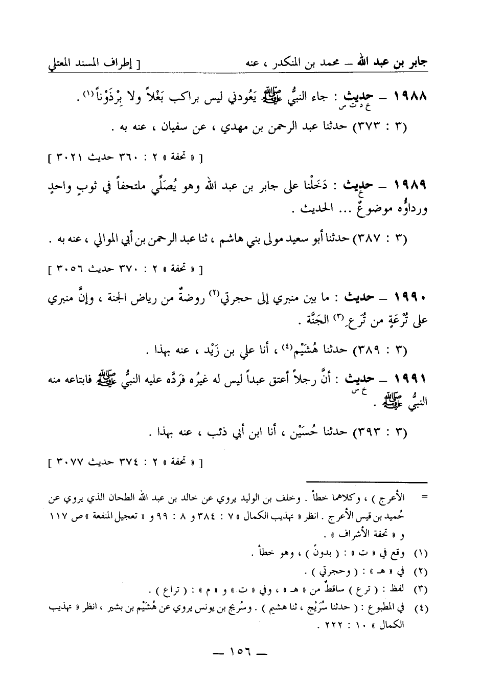 1990 - حديث: ما بين منبري إلى حجرتي روضة من رياض الجنة وإن منبري على ترعة من ترع الجنة (3: 389) حدثنا هشيم أنا علي بن زيد عنه بهذا