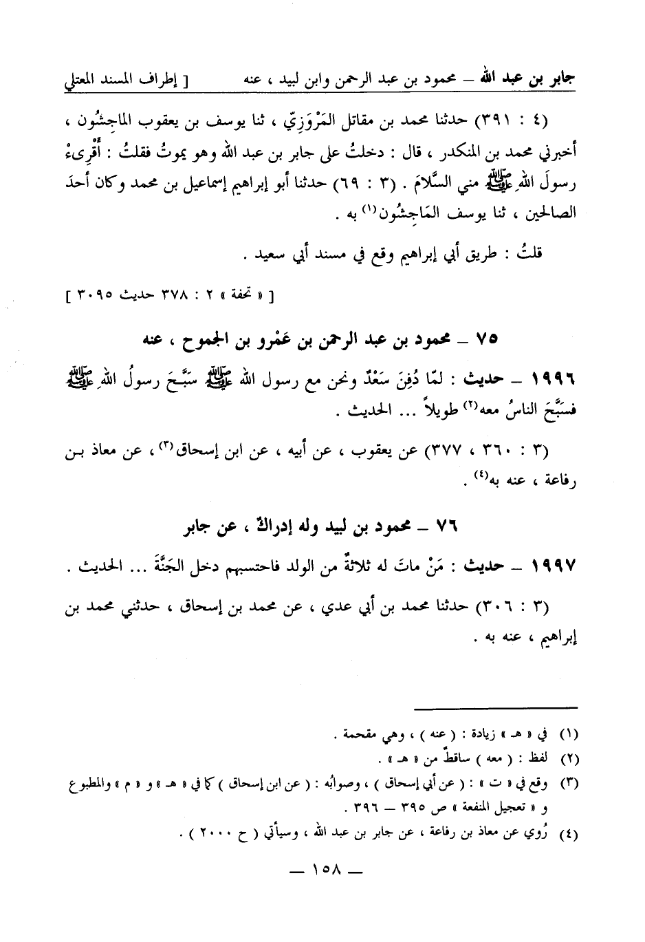 1997 - حديث: من مات له ثلاثة من الولد فاحتسبهم دخل الجنة..... الحديث (3: 306) حدثنا محمد بن أبي عدي عن محمد بن إسحاق حدثني محمد بن إبراهيم عنه به