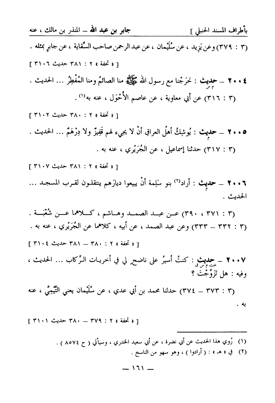 2006 -[م] حديث: أراد بنو سلمة أن يبيعوا ديارهم ينتقلون لقرب المسجد..... الحديث (3: 371، 390) عن عبد الصمد وهاشم كلاهما عن شعبة (3: 332 - 333) وعن عبد الصمد عن أبيه كلاهما عن الجريري عنه به