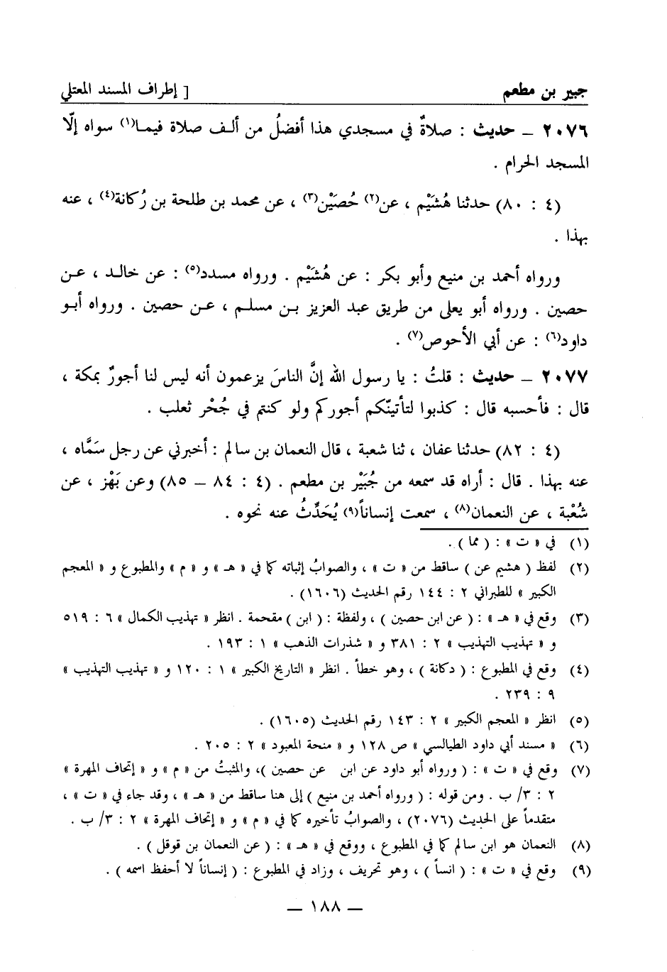2076 - حديث: صلاة في مسجدي هذا أفضل من ألف صلاة فيما سواه إلا المسجد الحرام (4: 80) حدثنا هشيم عن حصين عن محمد بن طلحة بن ركانة عنه بهذا ورواه أحمد بن منيع وأبو بكر عن هشيم ورواه مسدد عن خالد عن حصين ورواه أبو يعلى من طريق عبد العزيز بن مسلم عن حصين ورواه أبو داود عن أبي الأحوص