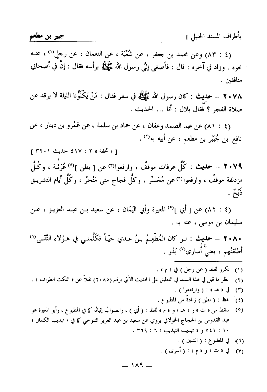 2078 -[س] حديث: كان رسول الله صَلَّى اللَّهُ عَلَيْهِ وَسَلَّمَ في سفر فقال: من يكلؤنا الليلة لا يرقد عن صلاة الفجر؟ فقال بلال: أنا..... الحديث (4: 81) عن عبد الصمد وعفان عن حماد بن سلمة عن عمرو بن دينار عن نافع بن جبير بن مطعم عن أبيه به