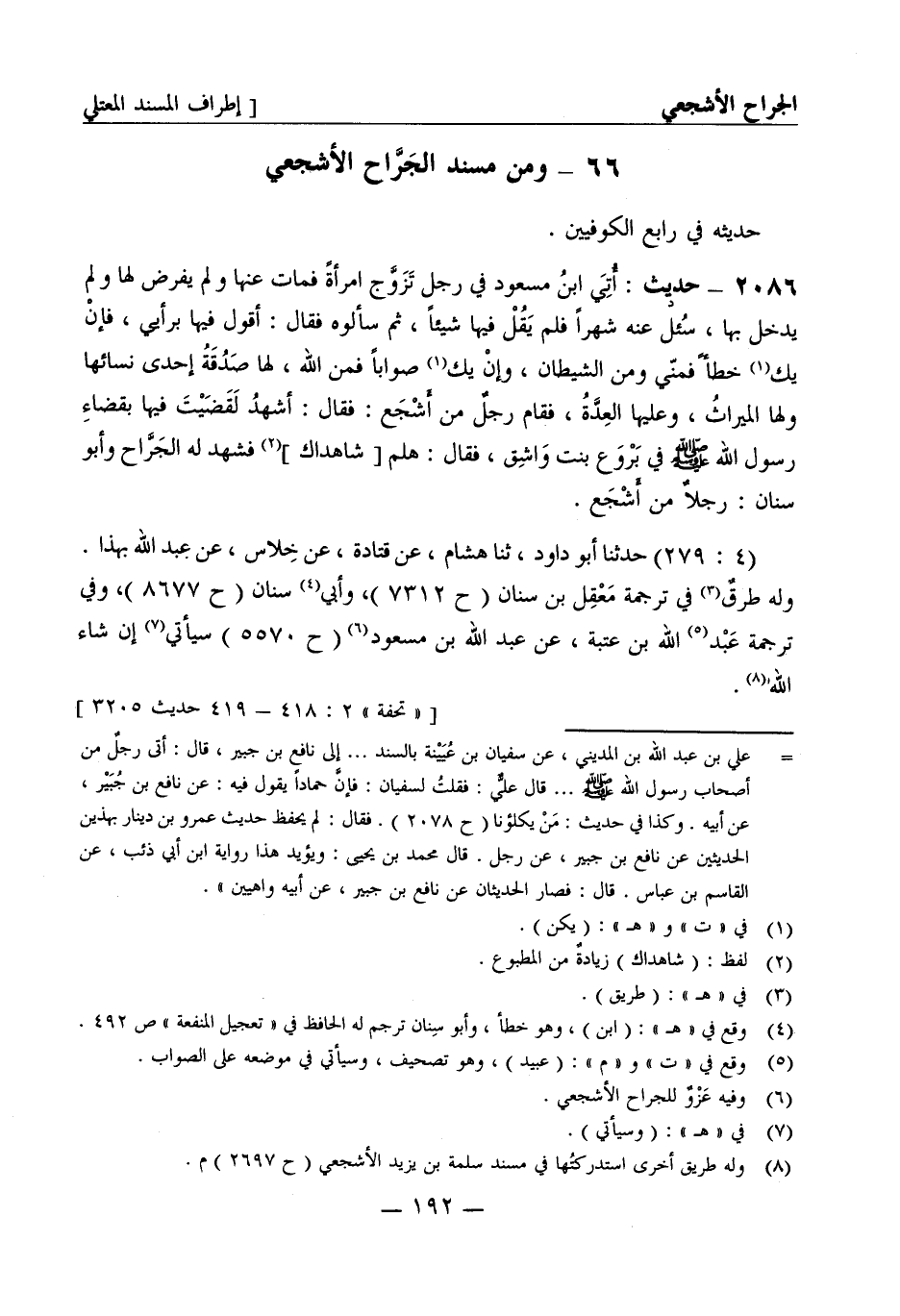 2086 -[د] حديث: أتي ابن مسعود في رجل تزوج امرأة فمات عنها ولم يفرض لها ولم يدخل بها سئل عنه شهرا فلم يقل فيها شيئا ثم سألوه فقال: أقول فيها برأيي فإن يك خطأ فمني ومن الشيطان وإن يك صوابا فمن الله لها صدقة إحدى نسائها ولها الميراث وعليها العدة فقام رجل من أشجع فقال: أشهد لقضيت فيها بقضاء رسول الله صَلَّى اللَّهُ عَلَيْهِ وَسَلَّمَ في بروع بنت واشق فقال: هلم شاهداك فشهد له الجراح وأبو سنان رجلا من أشجع (4: 279) حدثنا أبو داود ثنا هشام عن قتادة عن خلاس عن عبد الله بهذا وله طرق في ترجمة معقل بن سنان (ح 7312) وأبي سنان (ح 8677) وفي ترجمة عبد الله بن عتبة عن عبد الله بن مسعود (ح 5570) سيأتي إن شاء الله