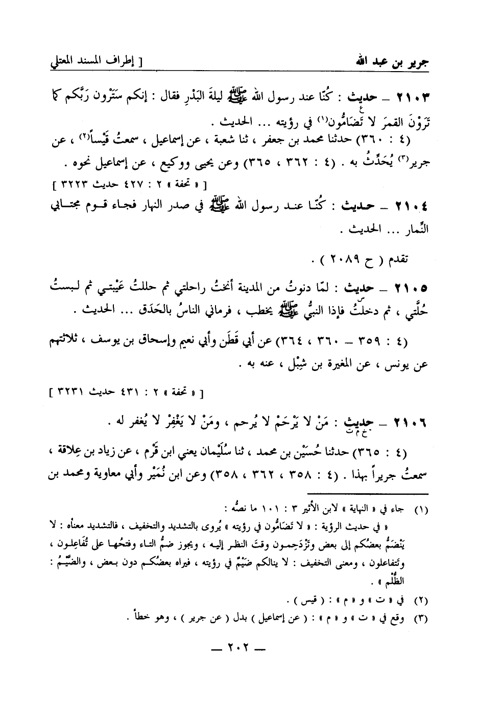 2103 -[ع] حديث: كنا عند رسول الله صَلَّى اللَّهُ عَلَيْهِ وَسَلَّمَ ليلة البدر فقال: إنكم سترون ربكم كما ترون القمر لا تضامون في رؤيته..... الحديث (4: 360) حدثنا محمد بن جعفر ثنا شعبة عن إسماعيل سمعت قيسا عن جرير يحدث به (4: 362، 365) وعن يحيى ووكيع عن إسماعيل نحوه